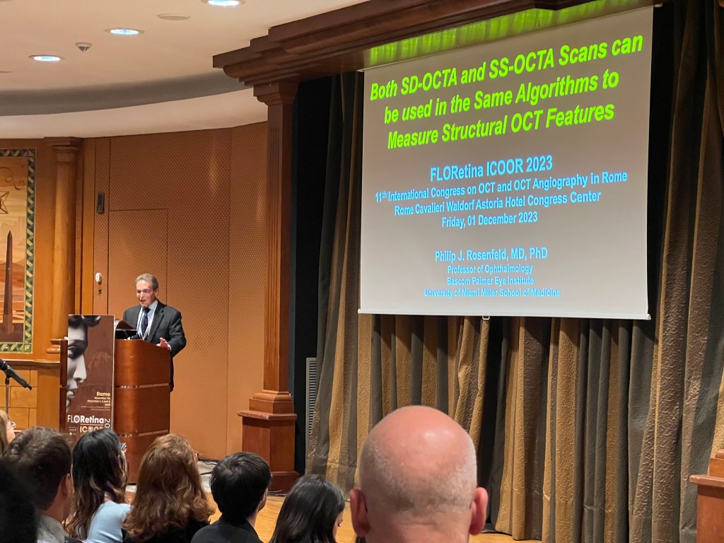 Dr. Philip J. Rosenfeld (above) from Bascom Palmer Institute, Miami, presented a talk commenting on the application of algorithms to measure structural OCT features on both SD-OCTA and SS-OCTA devices. While SS-OCTA scans can be used to identify many structural biomarkers, SS-OCTA devices are not widely available yet. Dr. Rosenfeld illustrated that SS-OCTA algorithms are compatible with SD-OCTA scans to measure drusen volume and drusen area, and hypertransmission defects (HTDs). Although SS-OCTA instruments provide a more accurate segmentation, there are no clinically significant differences in the measurements between the two types of devices. Dr. Rosenfeld concluded that SS- and SD-OCTA scans both contain important structural information that can be processed using the same algorithms.