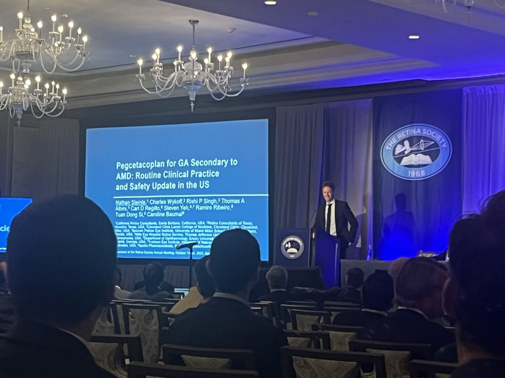 Dr. Nathan Steinle started this presentation by stating that there have been approximately 24,000 injections of pegcetacoplan administered from clinical trials to date as well as >100,000 vials distributed in the US for real-world clinical use. With time, there seems to be an increasing effect of pegcetacoplan with GA growth being 39% less for the treatment arm compared to sham over 24-30 months.