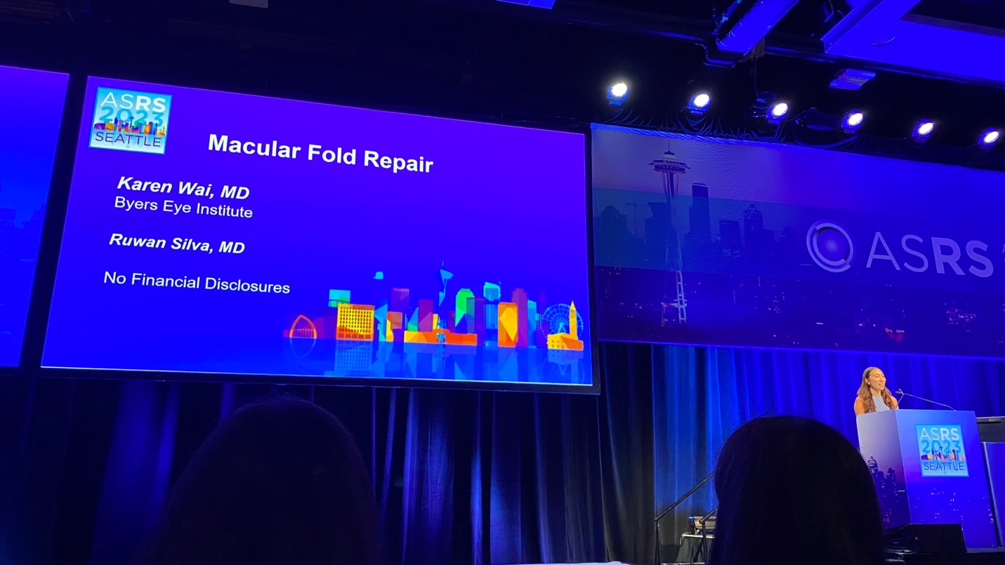 Dr. Karen M. Wai, MD, demonstrated macular fold repair after prior RRD repair. She detached the macula with balanced salt solution (BSS) using a 41g cannula by injecting from the periphery followed by PFO to flatten the area. Intraoperative OCT confirmed flattening with improvement of the fold. The panel discussed the main key is the prevention of macular folds, especially with gas tamponade. Dr. Berrocal will keep patients prone until they go home if she suspects fluid while others consider posterior retinotomy versus an incomplete fluid-air exchange to treat it like a “super” pneumatic.