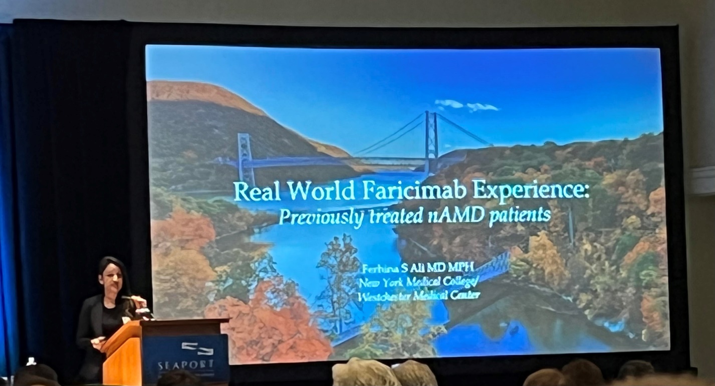 The next presenter was Ferhina Ali, MD MPH from New York Medical College who discussed real-world experience with faricimab. This bispecific antibody binds to VEGF-A and Ang-2, and was approved for treatment of diabetic macular edema and exudative AMD in January 2022, therefore real-world data is limited. The TRUCKEE study is an independent, physician led ongoing collaborative study looking at the safety and efficacy of faricimab in both treatment naïve and previously-treated patients with neovascular AMD. The TRUCKEE study demonstrated that faricimab is safe and well tolerated with stable visual acuity and rapid improvement in anatomic parameters (central retinal thickness and PED height) in both treatment naïve and previously treated patients with neovascular AMD. The FARETINA-AMD study provided important information on the early use, practice patterns and response to treatment in the real world using IRIS registry data. On average, patients had received 7 anti-VEGF injections approximately 5 weeks apart prior to initiating faricimab. After initiating faricimab, majority of patients were being extended to >6 week intervals after 2 injections of faricimab. Visual acuity parameters were also favorable. Both studies are ongoing and provide the most population-based information to date post recent approval of faricimab.