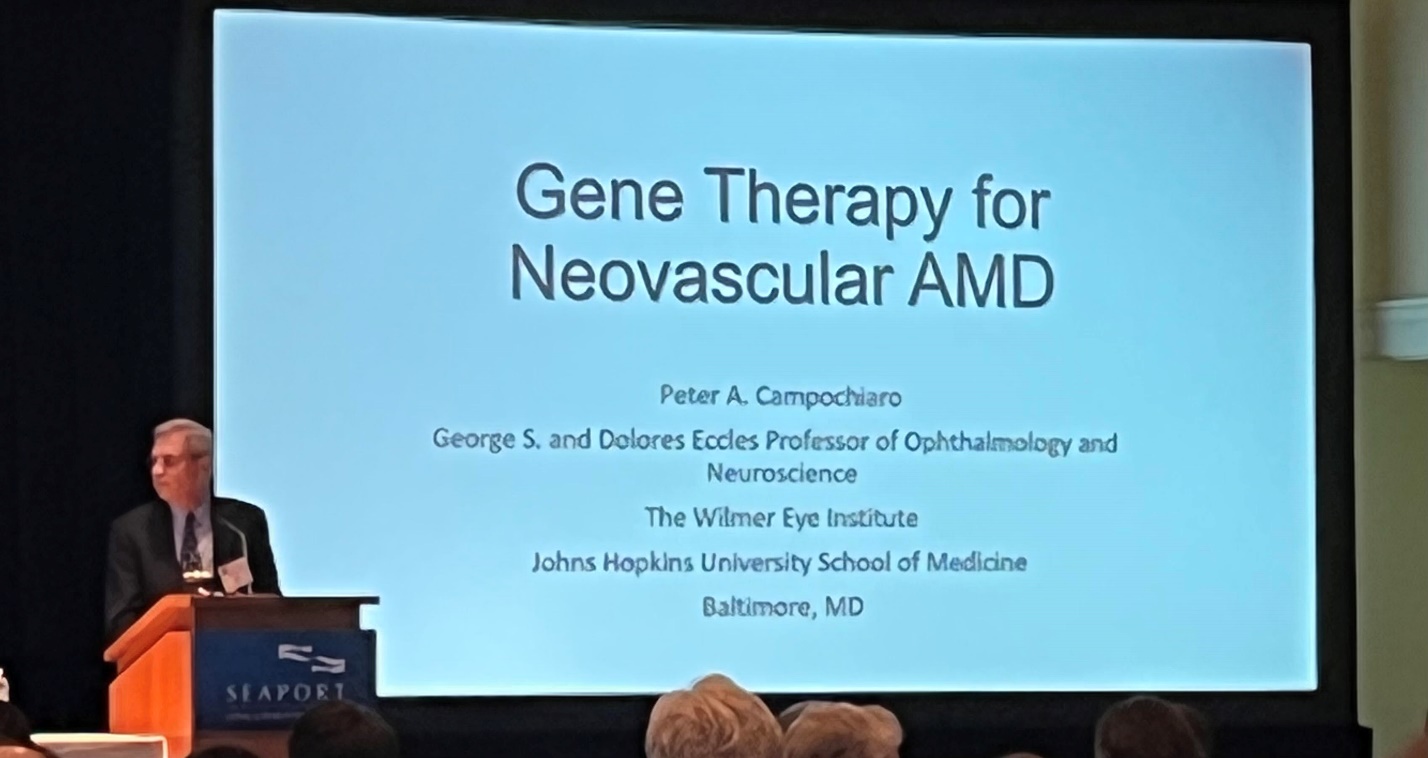 Peter Campochiaro, MD from Wilmer Eye Institute discussed the three routes of ocular delivery of gene therapy AVV vectors expressing anti-VEGF Fab (RGX-314) including subretinal injections, suprachoroidal injections and intravitreal injections for neovascular AMD. The subretinal RGX-314 Phase I/IIa study demonstrated long-term, durable treatment effect with stable/improved visual acuity and meaningful reductions in anti-VEGF burden. In terms of long-term safety, subretinal RGX-314 continues to be generally well-tolerated with a favorable immunogenicity profile. However, there were concerns for drug-related pigmentary changes that may represent transient RPE cell proliferation of unknown reasons. Next, Dr. Campochiaro reviewed the 6 month results for the AAVIATE phase II clinical trial of suprachoroidal RGX-314 compared to monthly injections. Treatment was well-tolerated in the preliminary data, and patients had stable visual acuity and retinal thickness similar to monthly injections but with 30-40% of patients not needing rescue injections. The intravitreal injection of gene therapy is currently being studied in vivo in mice and primates, with two agents called ADVM-022 and 4D-150. There is significant progress in the world of gene therapy with the hope of sustained expression and long-term suppression of exudation in patients with neovascular AMD.