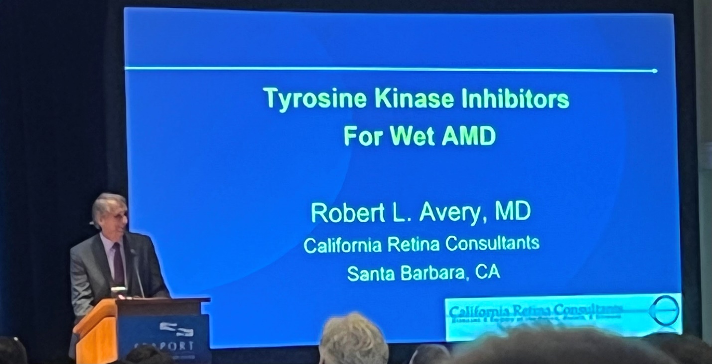 Robert L. Avery, MD from California Retina Consultants discussed the role of tyrosine kinase inhibitors (TKIs) in wet AMD. Previous uses of oral and eye drop TKIs had been published with either no benefit or systemic adverse effects. Currently, intraocular TKIs are being studied. Dr. Avery first discussed sunitinib, an intravitreal TKI that blocks all three VEGF receptors. Phase 1 studies demonstrated that there was a reduction in treatment burden although no visual benefit. In addition, migration of bio-absorbable particles in to the anterior chamber was associated with mild intraocular IOP elevation. Next was vorolanib, an intravitreal sustained-delivery insert. Phase 1 studies demonstrated an improvement in treatment burden and stable visual acuity and OCT thickness, especially if pretreated with anti-VEGF agents. Currently two phase 2 studies targeting wet AMD and DME are ongoing. Intravitreal and suprachoroidal axitinib are also in early phase study, aiming to reduce treatment burden and reduce fluid in conjunction with supplemental anti-VEGF agents.