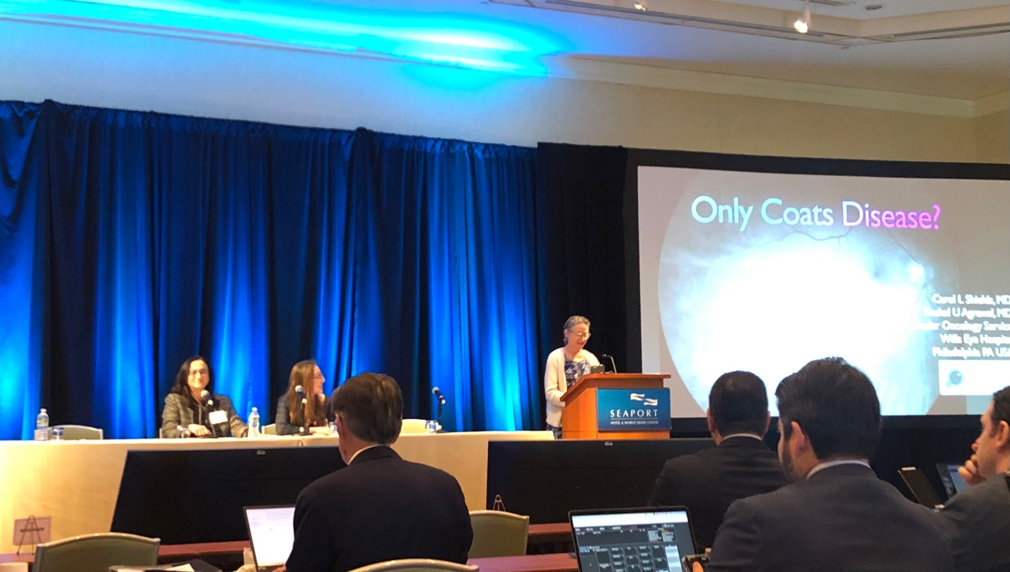 Dr. Carol Shields from Wills Eye Hospital discussed a case of a 15-year-old girl who presented with possible Coats disease in the right eye. She was small for gestational age and had a history of multiple fractures as well as a family history of leukemia and adenocarcinoma. On examination, she had retinal telangiectasia, exudation, and sclerosed vessels in the right eye. She also had drusen-like deposits, peripheral nonperfusion and retinal pigment epithelial detachments bilaterally. Systemic examination revealed short stature, poor growth, grey hair, ridged fingernails, and small head circumference. Genetic testing revealed a mutation in CTC1 gene consistent with Coats plus syndrome which is part of telomere biology diseases. The bilateral drusen-like deposits, a sign of aging, is unusual in this 15-year-old girl, yet consistent with telomere biology disease.