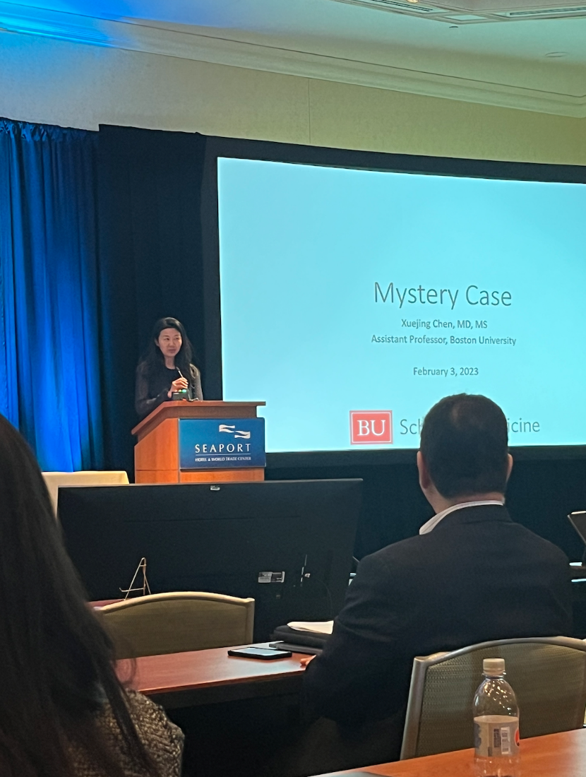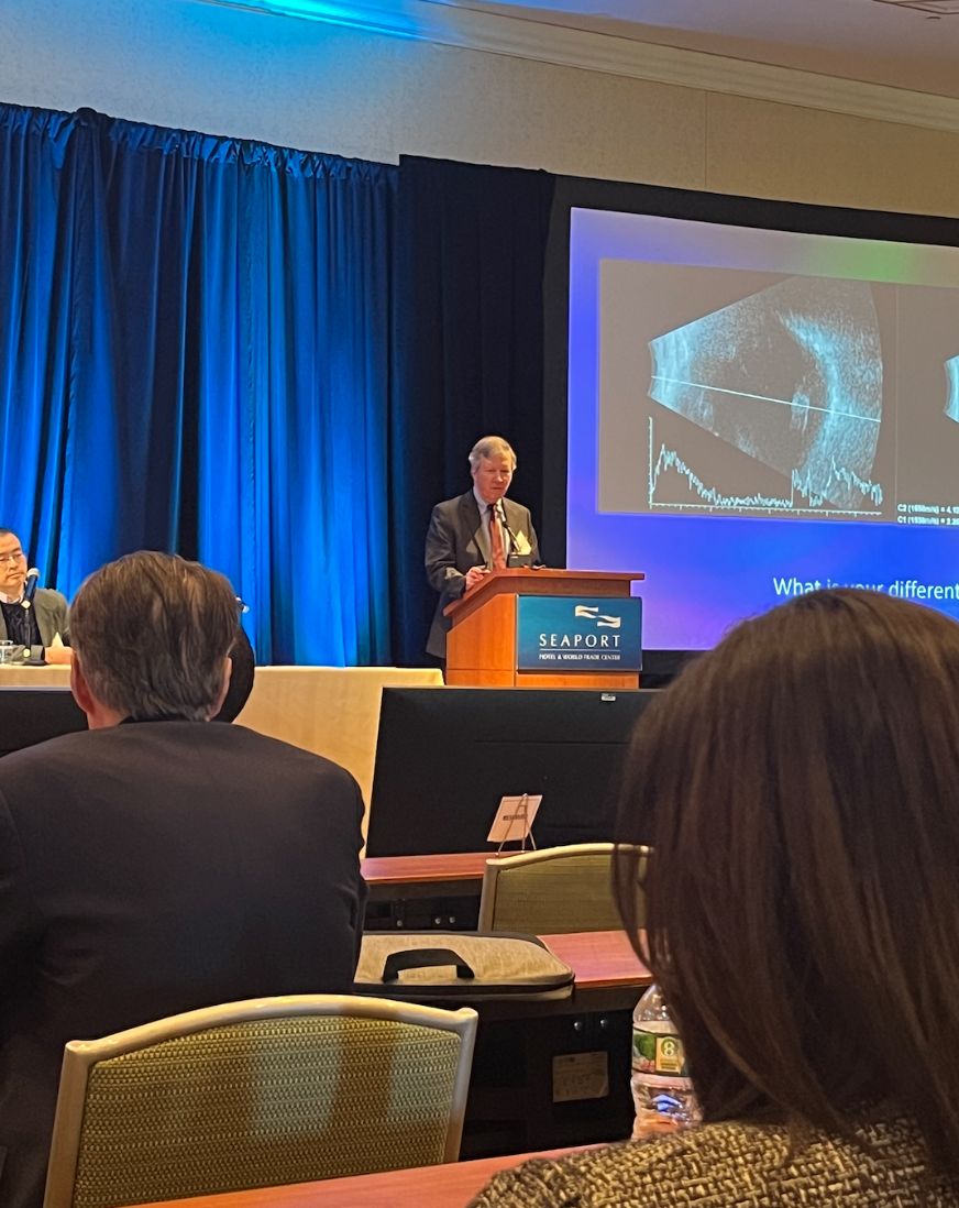 Xuejing Chen from Boston University presented an outstanding and unique case of Vogt-Koyanagi-Harada disease. Patient was a 42-year-old female from Trinidad who initially presented with unilateral painless vision loss in the left eye. Visual acuity was HM with a left RAPD. The exam was pertinent for rare vitreous cells and choroidal detachment in the periphery of the left eye. OCT showed a lumpy bumpy configuration with loss of the choroid architecture and basilar detachments. Patient was also noted to have short axial length with thickened sclera of the left eye. Extensive laboratory testing was performed as well as brain MRI which were unremarkable. She was diagnosed with VKH and started on oral Prednisone as well as topical steroids. This regimen was later transitioned to IMT. The presenter concluded the case by mentioning that, most likely, this presentation was unilateral given the shorter axial length and thickened scleral of the affected eye in comparison to the fellow eye.
