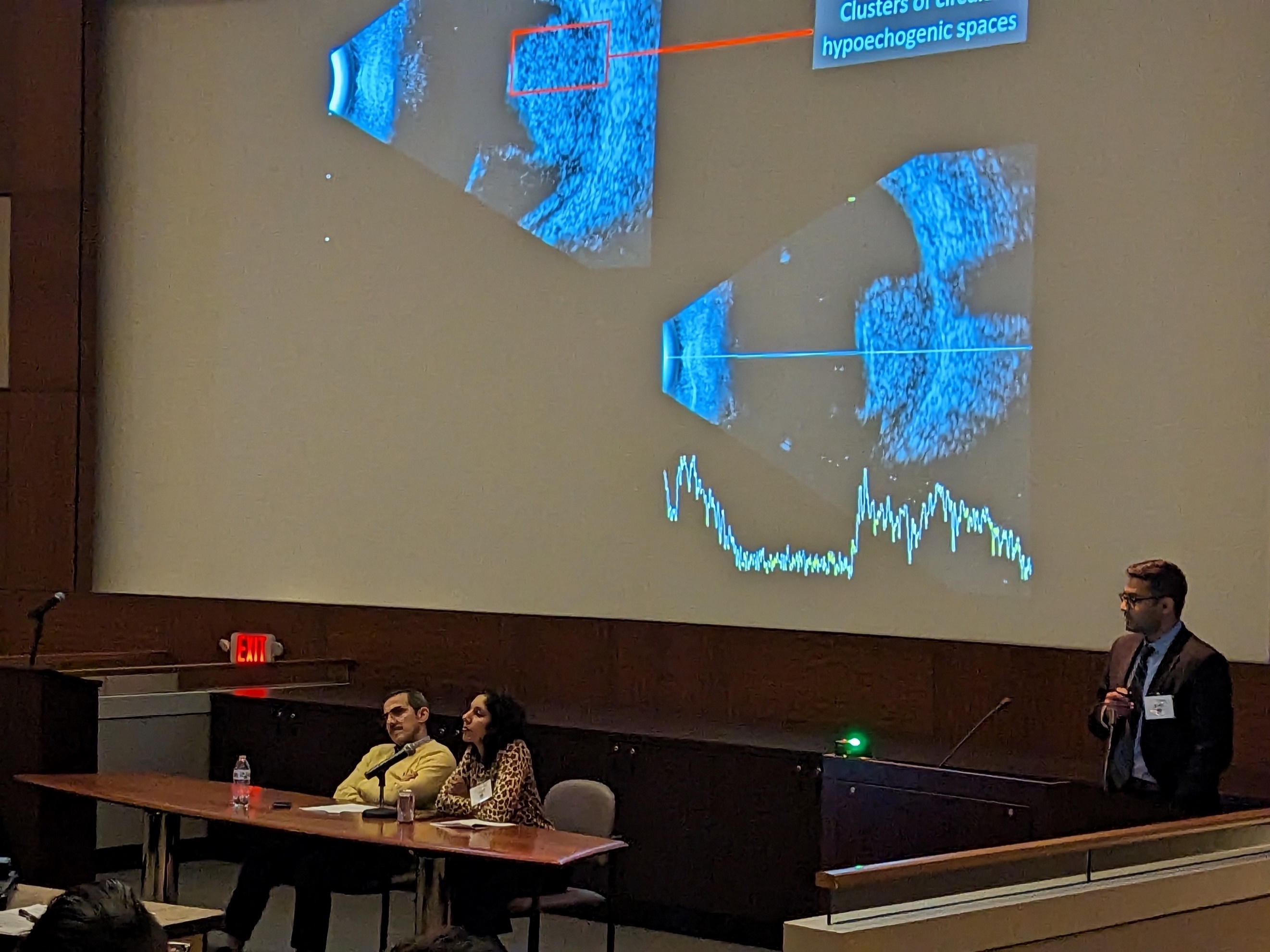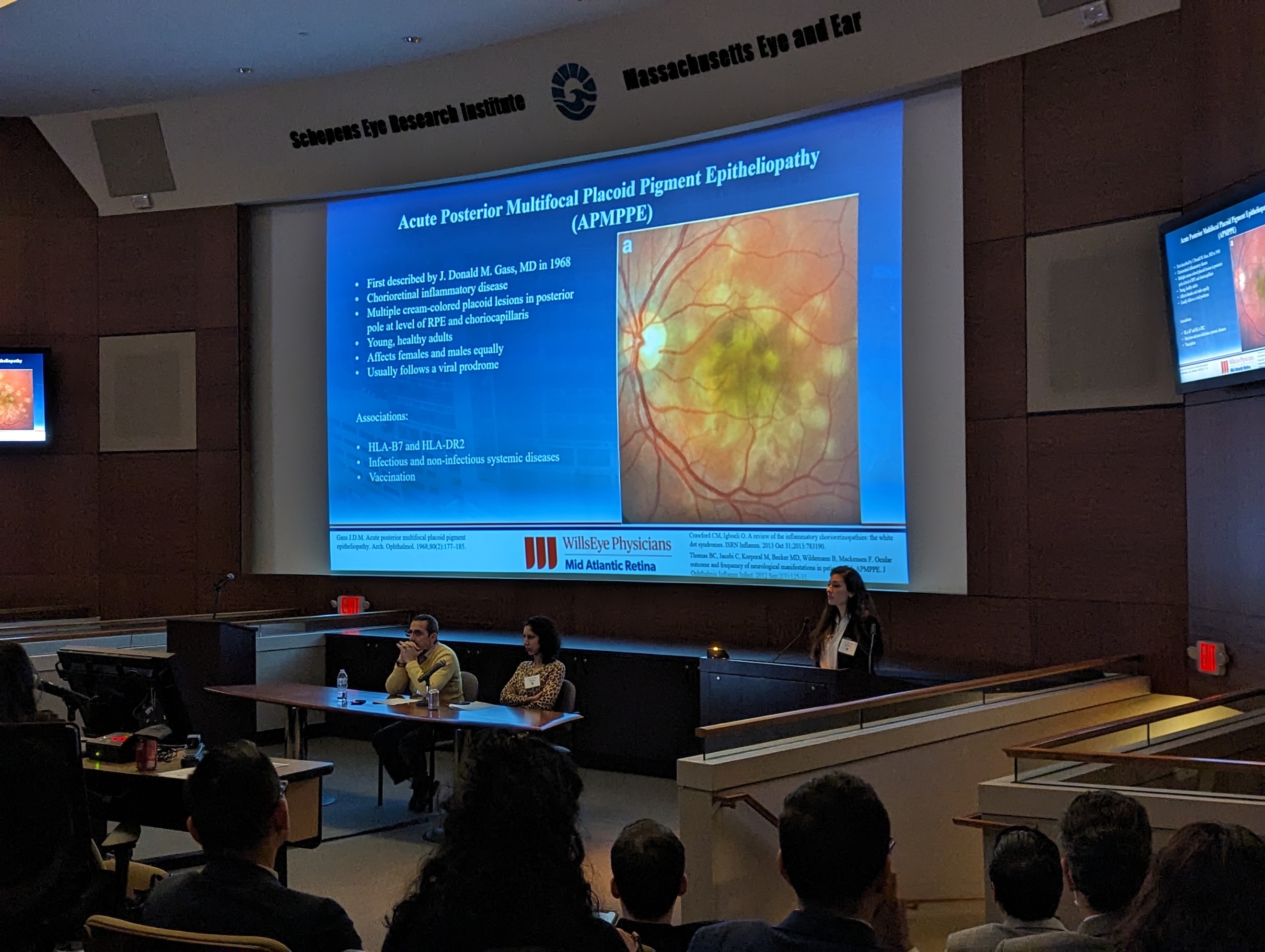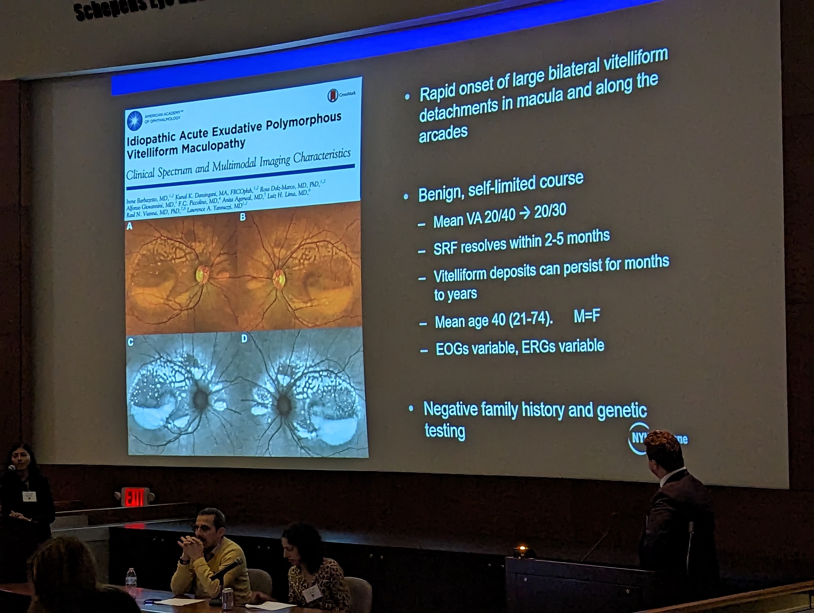 Dr. Samyuktha Guttha, a PGY2 resident from New York University then presented her case of a 39 year old female with decreased vision of both eyes for the past one month. Imaging demonstrated multifocal hyper-autofluorescent lesions, subfoveal blebs of subretinal fluid and thickening of the outer segment photoreceptors on SD-OCT. The patient had been previously diagnosed with “central serous” by an outside provider and started on eplrenone, with no improvement in findings on imaging. Given multiple bilateral multifocal serous detachments, accumulation of subretinal vitelliform material, no PEDs or leakage on fluorescein angiography to suggest CSR, a diagnosis of idiopathic acute exudative vitelliform polymorphous maculopathy was made. Dr. Guttha highlighted the importance of performing genetic testing on these patients and also ruling out malignancy given these constellation of findings can be a paraneoplastic phenomenon—both of which were done for this patient. Of course, Dr. Jose Pulido exclaimed the diagnosis fairly quickly. No stumping him!