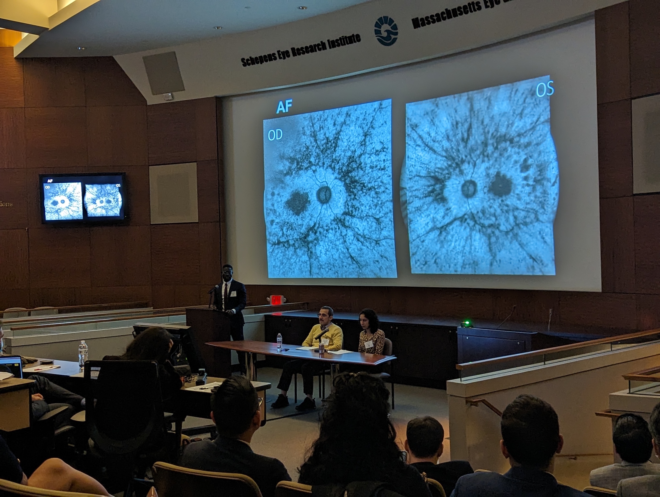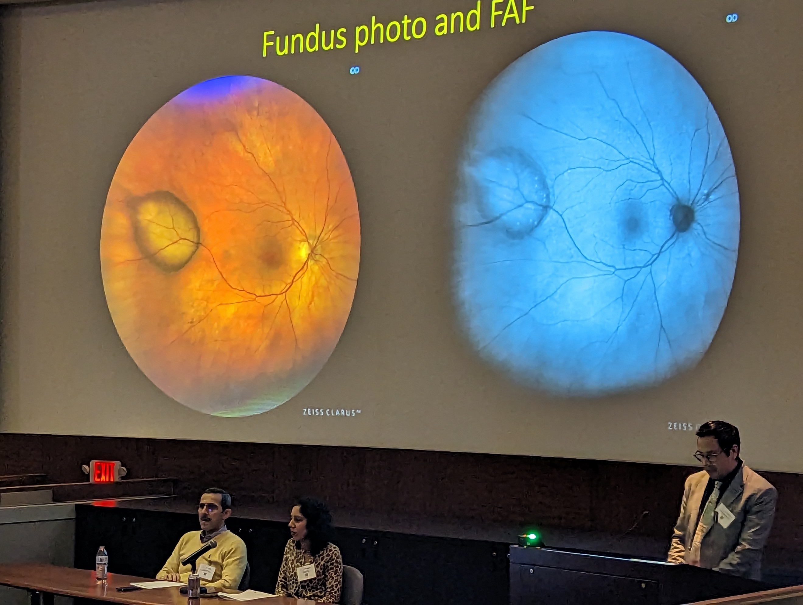 From here, Mohamed Sylla, a third year medical student from SUNY Downstate Medical Center presented on a case of a 29 year old Pakistani female with hand motions vision in both eyes, with progressively worsening vision as of childhood. The patient’s family history was remarkable for a maternal uncle with Leber’s Congenital Amarousis, and consanguinity of her parents. Imaging was significant for intra-retinal pigment deposits, bone-spicules, attenuation of the vessels, FAF with hypo-autofluorescent lesions in a radial pattern and in the macula, SD-OCT with loss of inner retinal layers, full-field ERG with diminished cone and rod responses. Genetic testing revealed a homozygous mutation in ABCA4, and a diagnosis of Group III Stargardt’s disease was made given rod and cone dysfunction. Interestingly, this form of Stargardt’s is only found in 17% of patients with Stargardt’s disease.