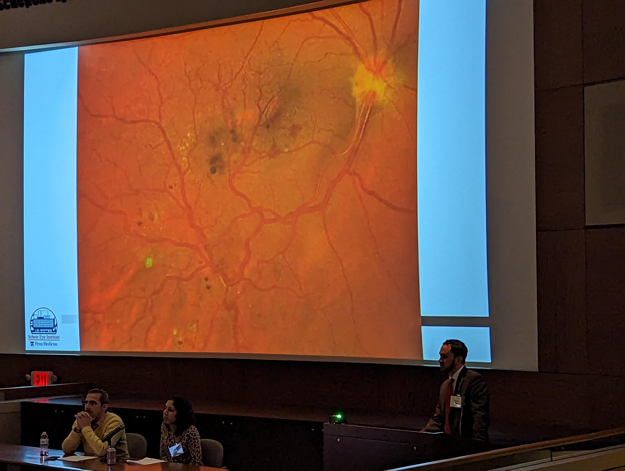 Subsequently, Dr. Devin Cohen, a third year ophthalmology resident from Scheie Eye Institute presented a case of a 45 year-old female referred for routine examination. Imaging of the right eye demonstrated inferotemporal enlarged arteries and veins, RPE changes, and exudation. OCT-angiography demonstrated a hyper-reflective plexus crossing over the raphe and FAZ at the level of the superficial capillary plexus. In discussion with the audience, a presumed diagnosis of congenital retinal macrovessel was made.