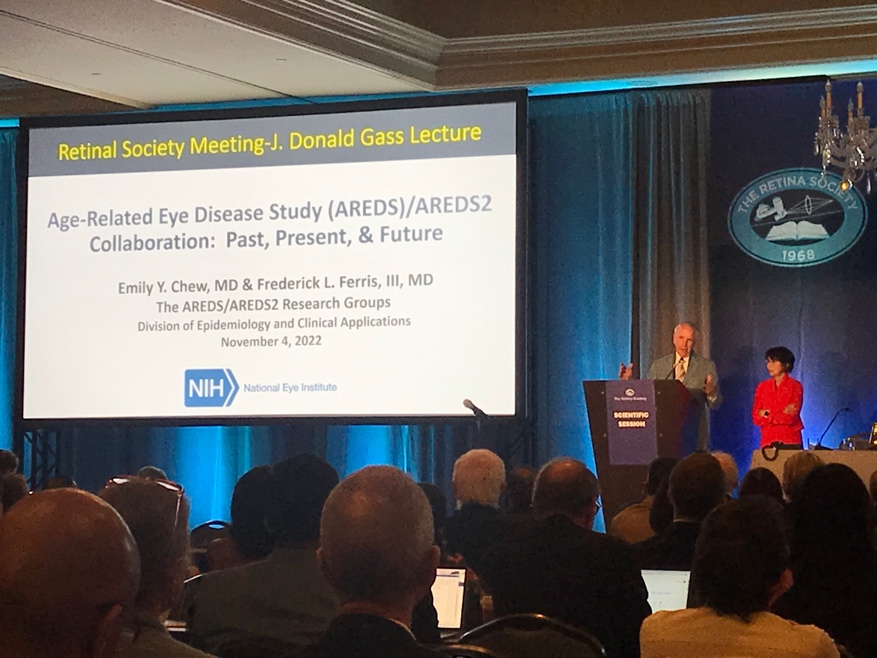 Both Dr. Frederick Ferris and Dr. Emily Chew of the National Eye Institute were awarded the J. Donald M. Gass Lectureship Award at Retina Society. After a sweeping introduction by Dr. Dan Martin, Dr. Chew reviewed the past, present and future of the AREDS/AREDS2 collaboration that was led in collaboration with Dr. Ferris. First, she outlined the history of the AREDS trials. In 1992, Dr. Ferris determined that a longitudinal study was needed to properly study geographic atrophy (GA) in age-related macular degeneration (AMD). They combined this with an interventional study to study whether micronutrients could impact the development of advanced AMD, which ultimately became the AREDS trial which ran from 1992-2001, followed by AREDS2 from 2006-2012. Even after trial conclusion, they continued long term follow-up, including ten year results, which produced datasets that many research teams have benefited from to enhance our understanding of AMD. Further, both the AREDS and AREDS2 vitamin formulations were found to be effective in reducing the chance of developing advanced AMD. Dr. Chew showed that 10 year results confirmed that not only was AREDS2 superior because it did not increase the risk of lung cancer in smokers, but also that the lutein substitution actually outperformed beta-carotene in preventing advanced AMD.