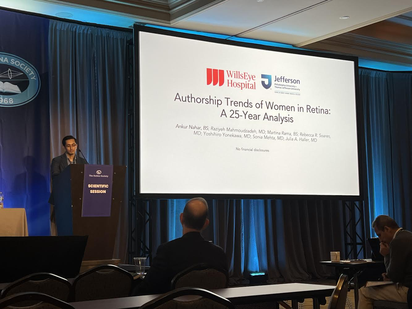 Ankur Nahar then presented a 25-year analysis of authorship trends of women in retina. There has steadily been an increase in the percentage of women in ophthalmology, from 24% in 2003 to 34% in 2017; this change is largely due to an increase in female assistant professors rather than women in higher academic rank. Authorship is important to look at due to its critical component in career advancement within academia, and was thus used as a proxy for gender disparities in retina in this study. The results showed that the percent of women in first and last authorship positions both significantly increased from 1995 to 2020, and first authors were more likely to be women when the last authors were also women. Furthermore, the productivity of female last authors was significantly disproportionate to their representation in the field. Similarly, the study found that women disproportionately chose academic positions relative to their representation in the field. In conclusion, while a disparity in authorship persists in ophthalmic subspecialties, Retina is a field where the gap is improving, emphasizing the important role of female mentorship in ensuring gender representation and closing the gender gap. ![]()