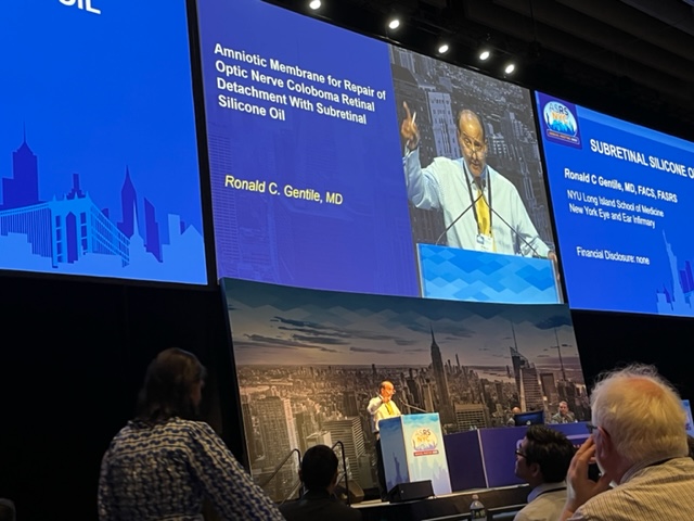 Case 5: Dr. Ronald Gentile from New York Eye and Ear Infirmary then presented a case of a middle aged man who was referred for subretinal silicone oil following two prior pars plana vitrectomies. Examination revealed a large optic nerve coloboma. Amniotic membrane was placed over the optic nerve, a retinectomy was created, and PFO was used to remove the subretinal silicone oil. Post operatively, the patient developed macular subretinal fluid, hypothesized to be due to migration of cerebrospinal fluid versus direct communication with the vitreous cavity. On repeat PPV, an amniotic membrane was placed inside the coloboma and the patient had successful resolution of subretinal fluid. Dr. Gentile highlighted the use of amniotic membrane as a barrier against migration of intraocular tamponades and redetachment for optic nerve colobomas