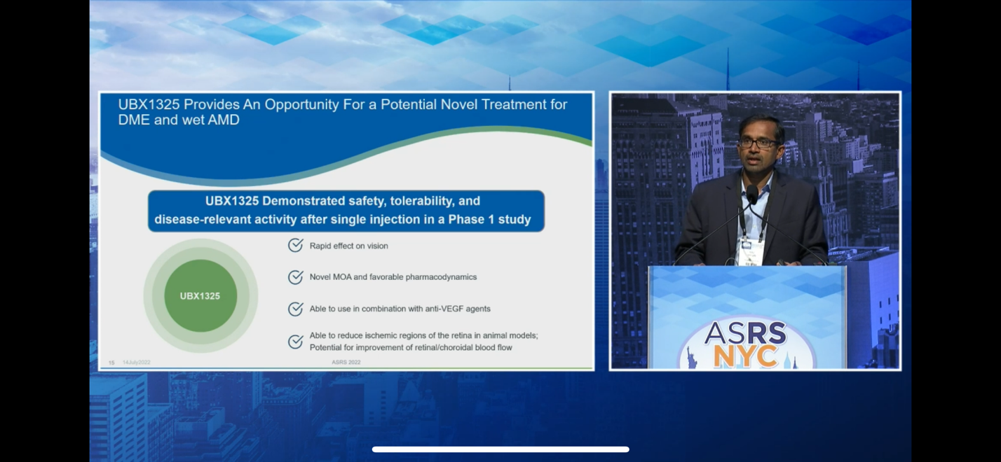 Dr. Raj Maturi, MD presented on UBX1325, A Novel Senolytic Therapy for Treatment Experienced Patients With Chronic DME or Wet AMD: 24-Week Results of a Phase 1 Study. First, Dr. Maturi discussed how cell stress leads to increased senescent cells which induce a host of inflammatory cytokines subsequently leading to fibrosis and other adverse effects. The idea behind UBX1325 was to develop a specific therapy to remove senescent cells thereby removing these harmful cytokines. UBX1325 is a novel irreversible inhibitor of BclxL.