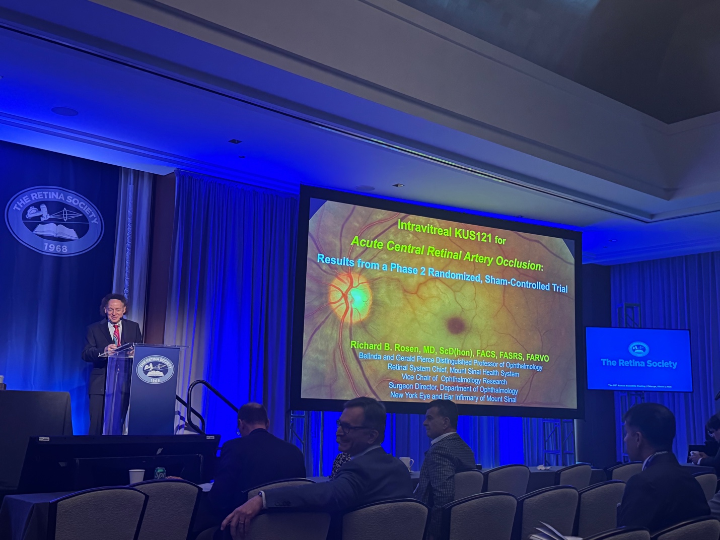 The second late breaking presentation was delivered by Dr. Richard Rosen of New York Eye and Ear Infirmary of Mount Sinai. The study evaluated a novel intravitreal therapeutic (KUS121) for patients with non-arteritic CRAO. KUS121 is a cytoprotective compound, aimed to reduce metabolic stress from ischemia. The study was a multicenter phase 2 trial.