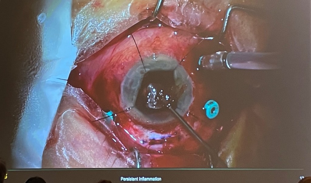 Next, Kareem Moussa, MD presented a case of chronic post-operative endophthalmitis after uncomplicated cataract surgery. The patient had a negative anterior chamber tap performed elsewhere and a negative systemic uveitis workup before he was referred to Dr. Moussa. The patient was treated with steroids but had recurrent inflammation each time the steroids were tapered. Dr. Moussa repeated the anterior chamber tap, which was positive for Cutibacterium acnes (C. acnes). The patient underwent vitrectomy with intraocular lens and capsular bag explanation (see photo). Dr. Moussa concluded that in cases of suspected infectious uveitis, consider repeating the anterior chamber tap yourself. Moreover, C. acnes is a condition that usually requires surgical intervention.