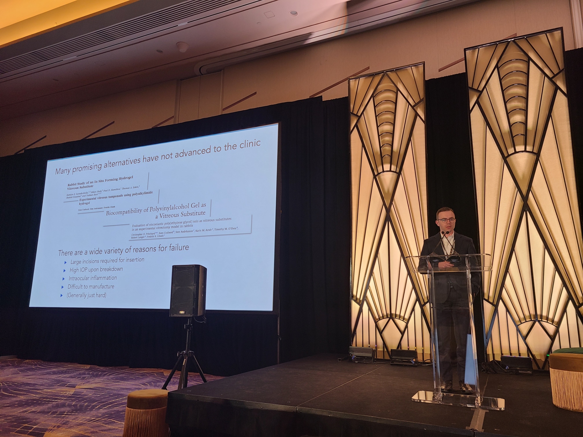 Dr. Tony Stefater’s talk discussed the use of a novel tamponade agent in repairing rhegmatogenous retinal detachments. He presented results on some of the first human patients that underwent detachment repair with this novel polymer tamponade which was applied on the retinal tears. These initial findings showed that this novel agent can potentially aid in RD repair without requiring gas or silicone oil for tamponade or the need for post-operative positioning.