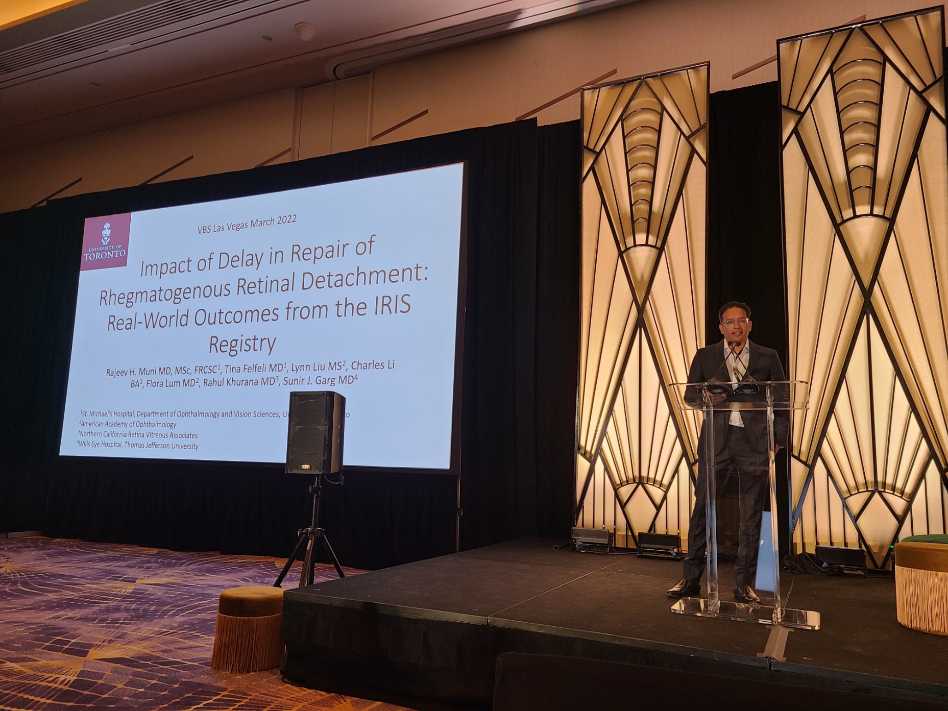 Dr. Rajeev Muni presented data on timing of surgical repair for fovea-off and fovea-on retinal detachments using the IRIS database. His analysis showed evidence for improved visual outcome in the group of patients that received earlier repair in both fovea-on and fovea-off patients. He concluded that fovea-off detachments repaired within three days and fovea-on detachments repaired within a day had better outcomes. Finally, he demonstrated patients an example of the slow course of photoreceptor recovery over the span of many years after surgery.
