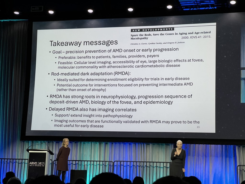 Another major histologic correlate of RMDA dysfunction is the presence of subretinal drusenoid deposits, which were associated with significant RMDA delays and represent an important structural biomarker of AMD risk. Key findings included delayed RMDA in eyes with normal fundus appearance may predict future AMD onset. Moreover, RMDA5 was the only functional measure significantly worse in early AMD eyes than in normal eyes. Drs. Owsley and Curcio emphasized optimizing the RMDA test for efficiency, linking RMDA outcomes to patient-reported visual function, and leveraging retinal carotenoid imaging as a nutritional and genetic biomarker. Lastly, they highlighted innovative imaging and precision medicine strategies to prevent AMD before irreversible damage like neovascularization or geographic atrophy occurs.