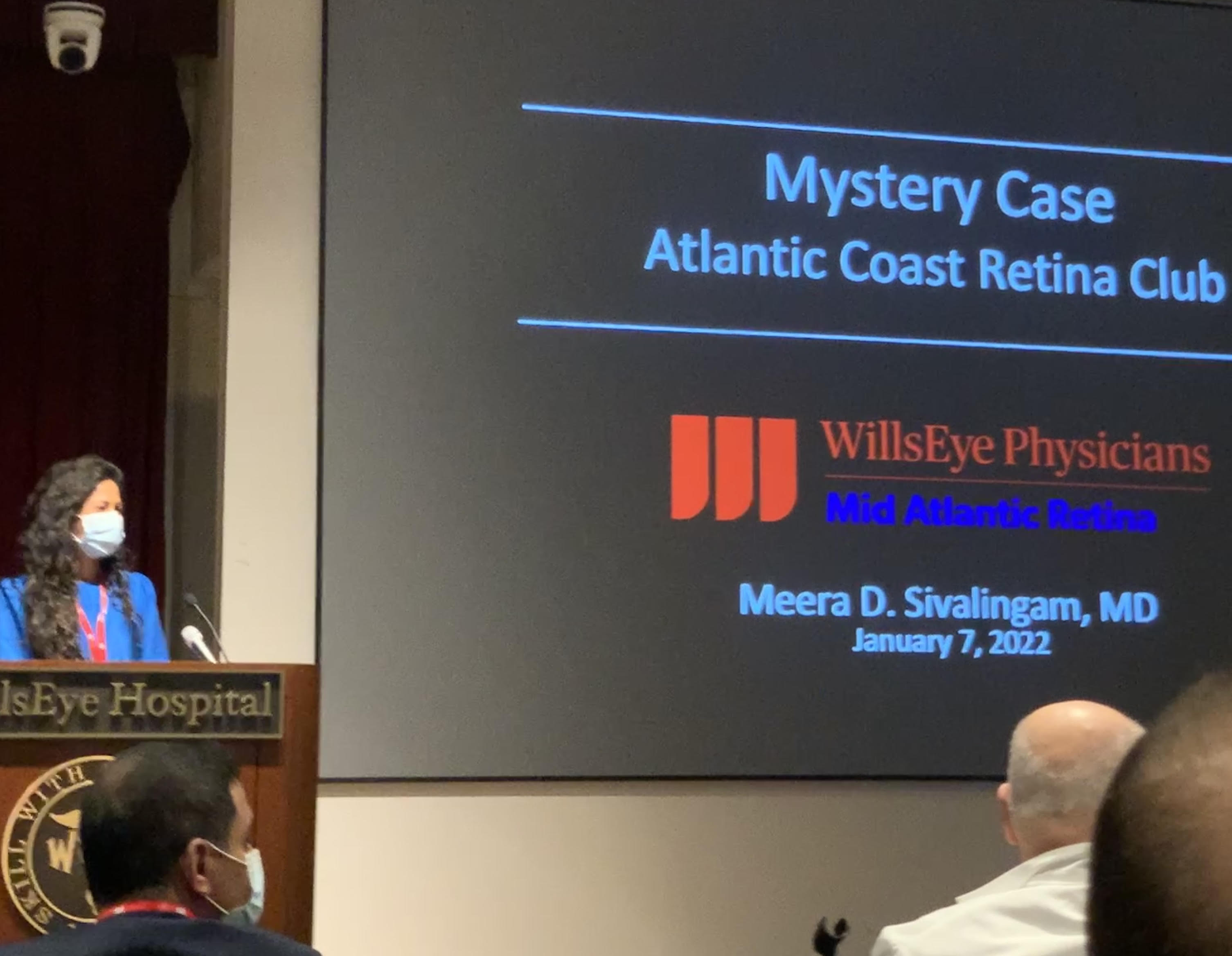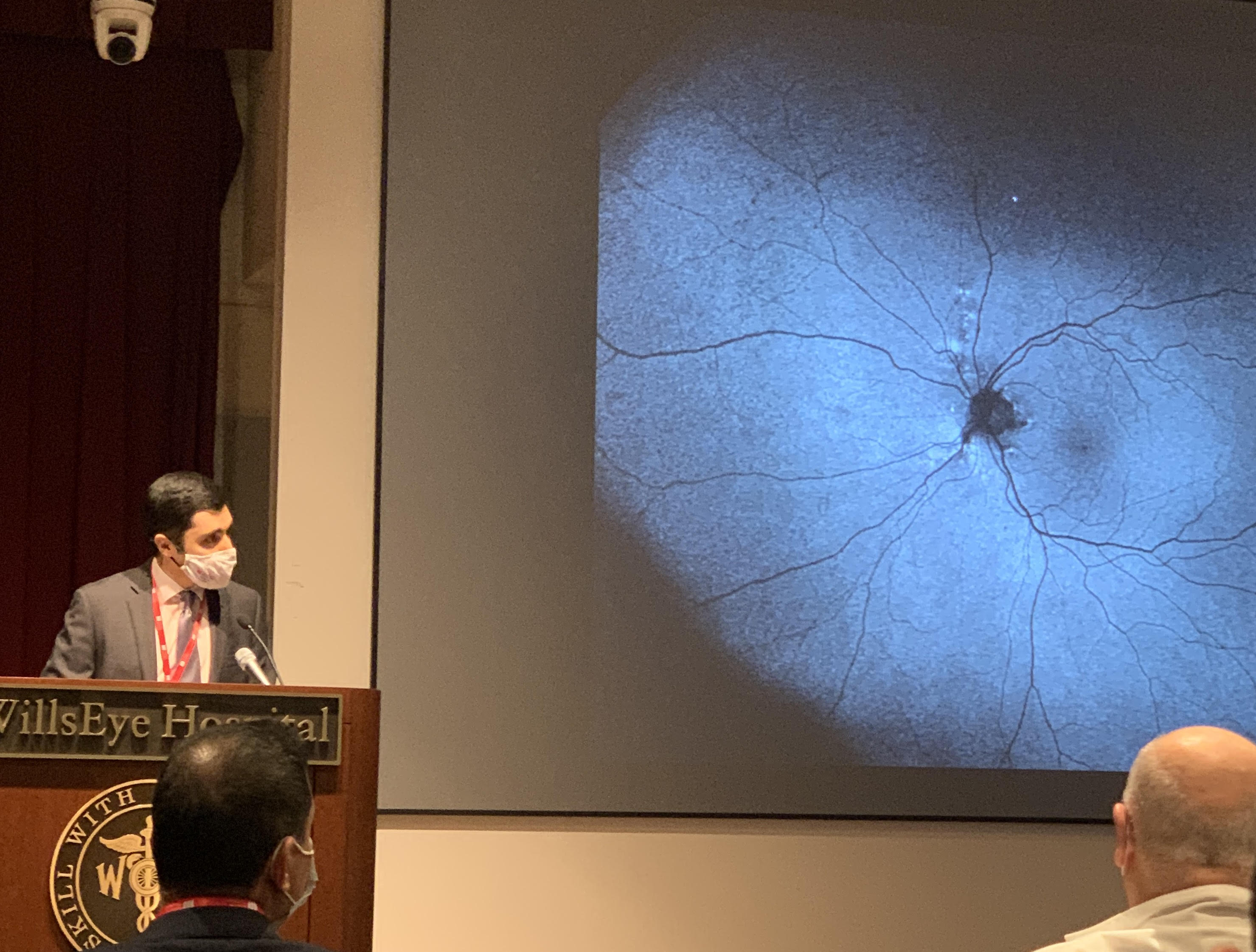 Dr. Meera Sivalingam, a first year Wills Eye retina fellow, skillfully employed multimodal imaging to showcase a case of a chronic bilateral central serous chorioretinopathy (CSCR) with macula edema and extensive serous choroidal detachments – rare findings in CSCR. Resolution of the edema and choroidals were achieved with oral eplerenone. This led to a heated discussion amongst the crowd regarding the use of eplerenone as well as the role of PDT in these eyes with extensive peripheral lesions.