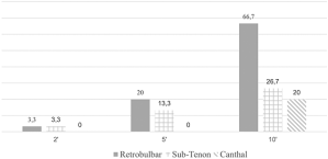 5 mL of 2% mepivacaine hydrochloride was used for each type of block and the blocks were given as follows: a retrobulbar block (RB) was given with a 27-gauge 31 mm needle; sub-tenon’s anesthesia (STA) was given after an incision was made in the inferonasal quadrant and blunt dissection of sub-tenon’s layer was performed; and medial canthus episcleral anesthesia (MCEA) was given via a 26-gauge short bevel needle between the eyeball and semilunaris fold medially. For each block, 1000 mg/100 ml of paracetamol was also administered.