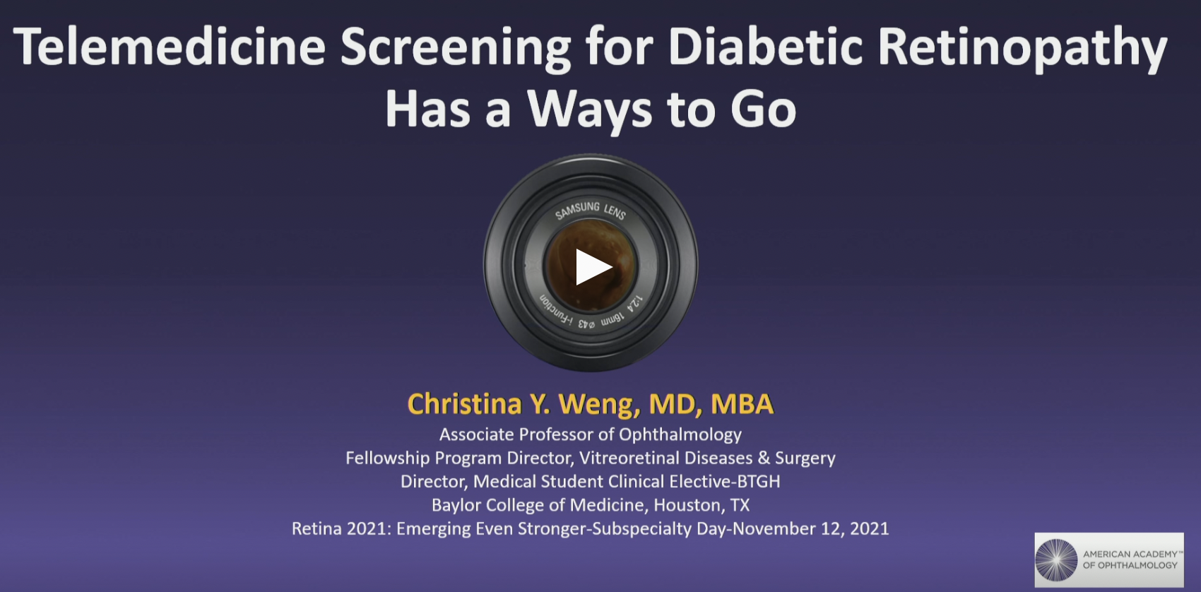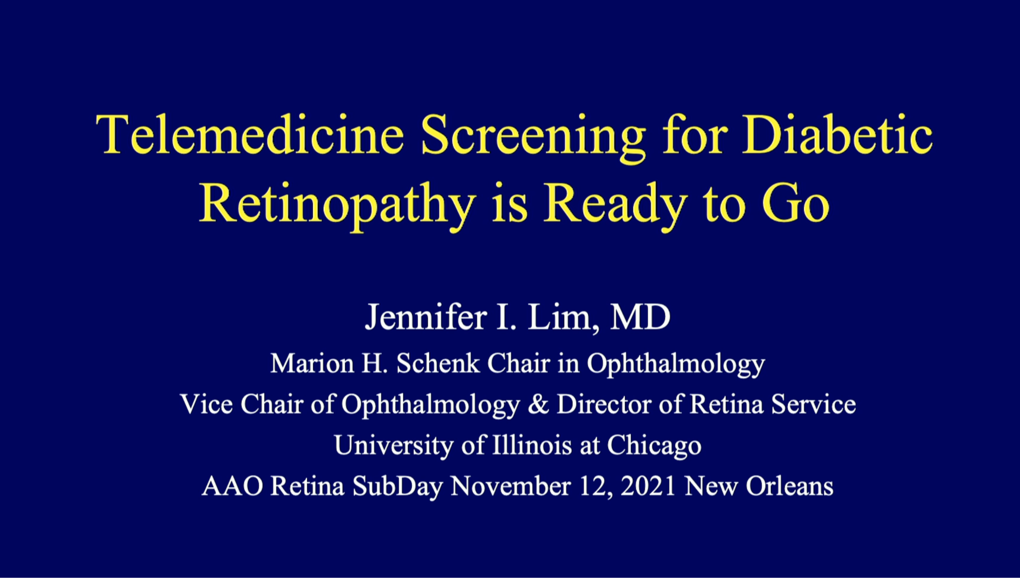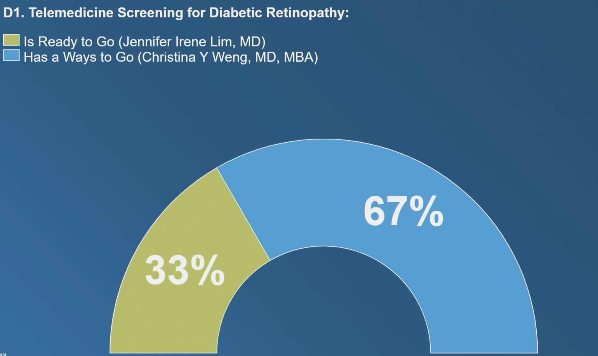 Dr. Jennifer I. Lim, MD from the University of Chicago at Illinois argued that telemedicine screening is ready to go, noting that telemedicine screening addresses the diabetic retinopathy burden, is efficient and effective, and has been automated using AI algorithms approved by the FDA. Dr. Lim cited the growing diabetic retinopathy screening burden globally with 415 million diabetics in 2015, predicted to rise to 642 million diabetics by 2040. She noted that telemedicine screening addresses the shortage of eyecare providers and addresses the mismatch of providers and patients (rural and socioeconomically disadvantaged) which can lead to disparities of care. Dr. Lim then reviewed the efficiency of telemedicine screening which was found to increase screening rate from 29.9% to 47.7% (de Carvalho et al. 2020). She continued that while only 30-50% of diabetic patients see an eyecare provider, 88% visit their PCP at least once a year, providing an opportunity for point of care screening. This was studied at the Wills Eye Hospital where 9,946 patients were screened at a PCP visit, 16.6% of whom were found to have diabetic retinopathy in at least one eye and 25% with other eye disease (Gao et al. 2019). Similarly, telemedicine screening was implemented in remote medical clinics on Native American reservations and urban family practice clinics and diabetic retinopathy was found in 12.6% and 29.6% of eyes respectively (Chin et al. 2013). Lastly, Dr. Lin noted that telemedicine systems allow for physician treatment rather than disease screening with high sensitivity and specificity of current FDA approved AI systems IDxDR (87.2% sensitivity, 90.7% specificity) and EyeArt (96% sensitivity, 88% specificity).