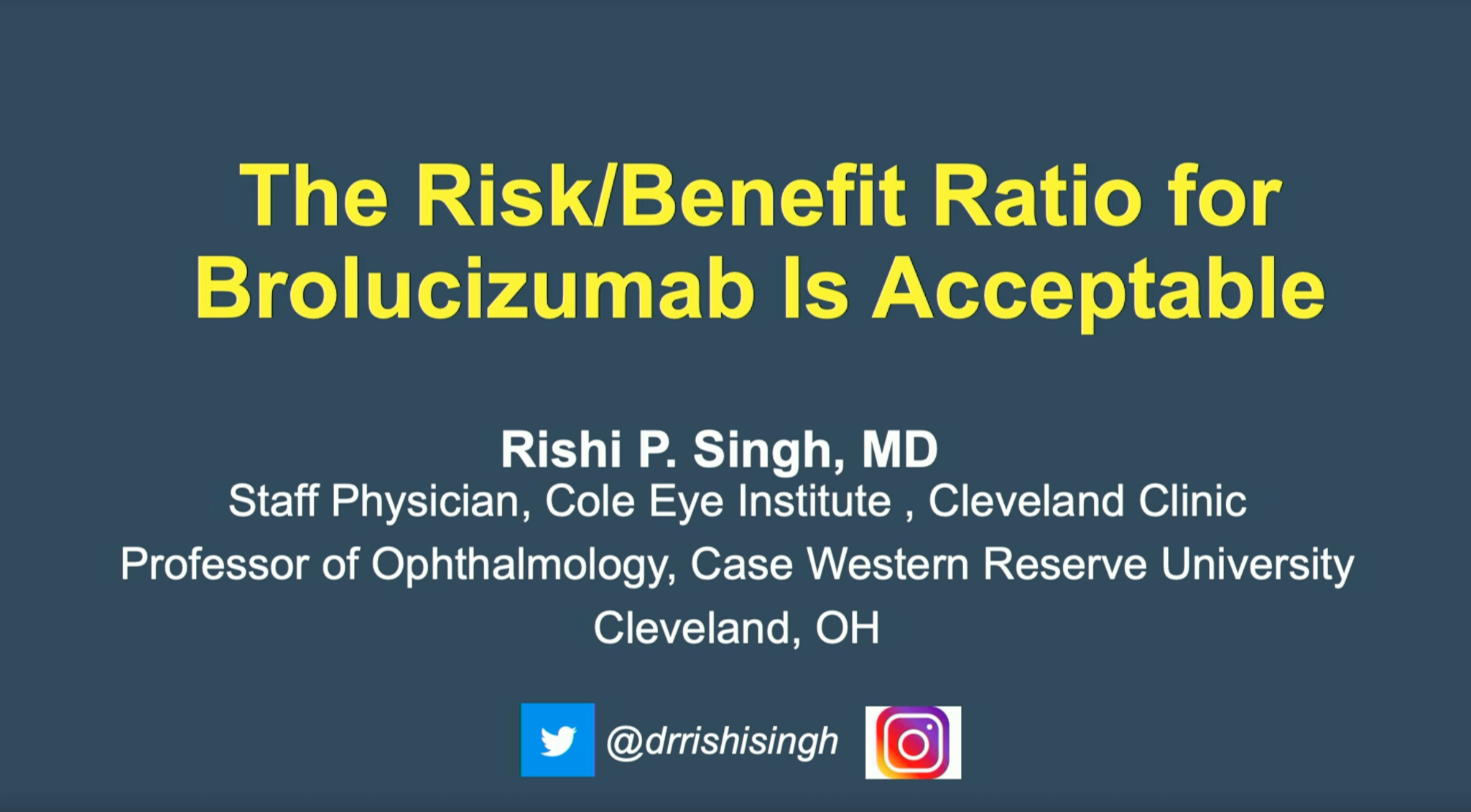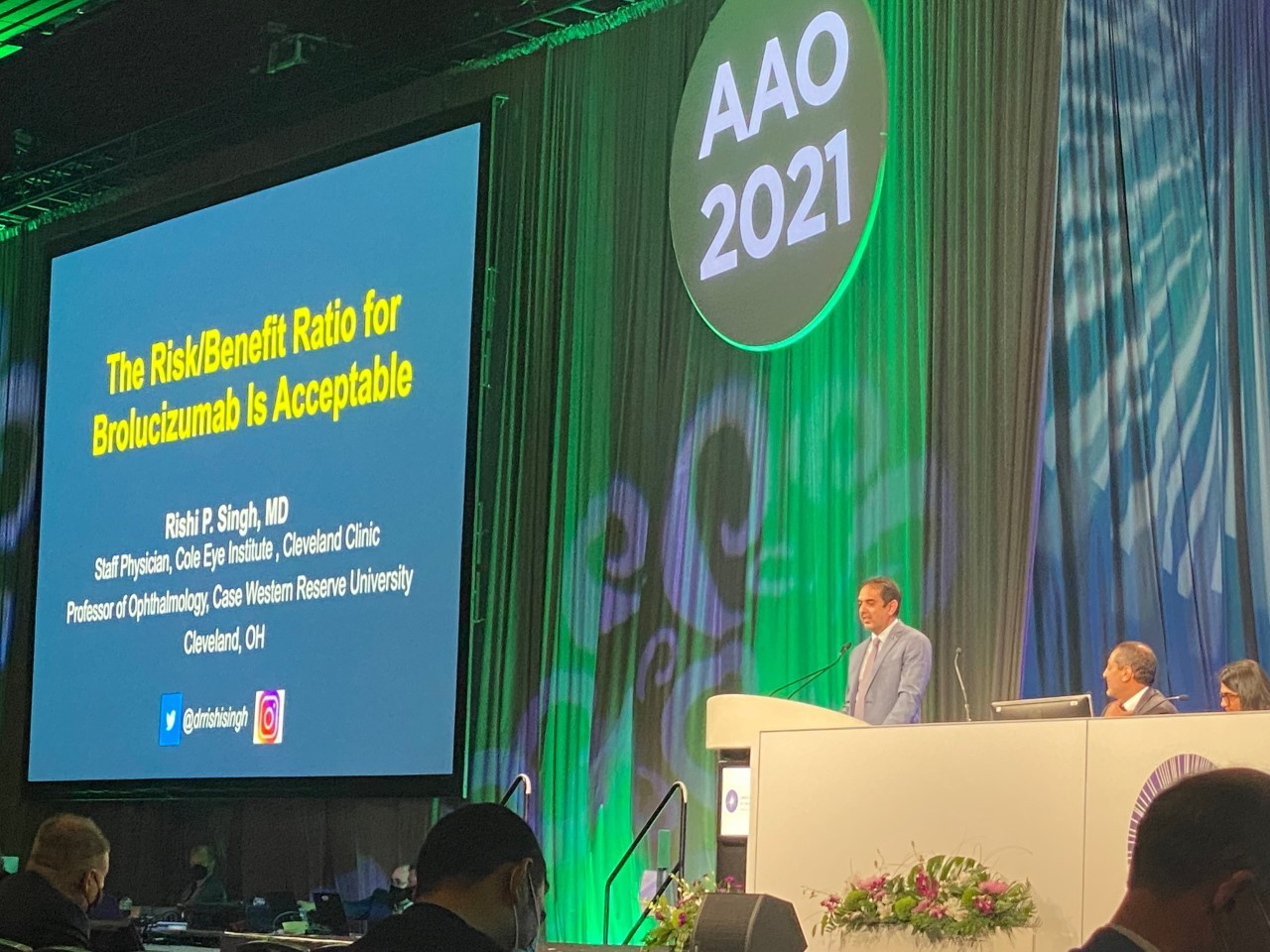 Dr. Rishi P. Singh, MD from Cole Eye Institute, The Cleveland Clinic contended that the Phase 3 studies HAWK and HARRIER validated its equivalence in visual acuity to aflibercept. Additionally he pointed out its superiority in regard to CSFT including SRF and IRF in Phase 3 studies. Furthermore, half of patients were on q12 dosing by the end of year one. Dr. Singh acknowledged the primary issues of retinal vasculitis and retinal occlusive disease that have been validated in the IRIS and KomodoHealth databases. He further acknowledged that the MERLIN study which dosed on a q4 interval was halted and that brolucizumab is only approved for use every 2 months by the FDA. However, per Dr. Singh, in certain cases, the risk benefit ratio is acceptable – in patients with early residual fluid and high frequency of treatment. However, he again affirmed that brolucizumab is contraindicated in those with prior intraocular inflammation events.
