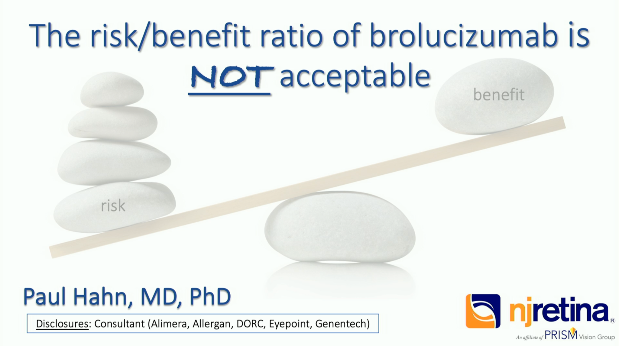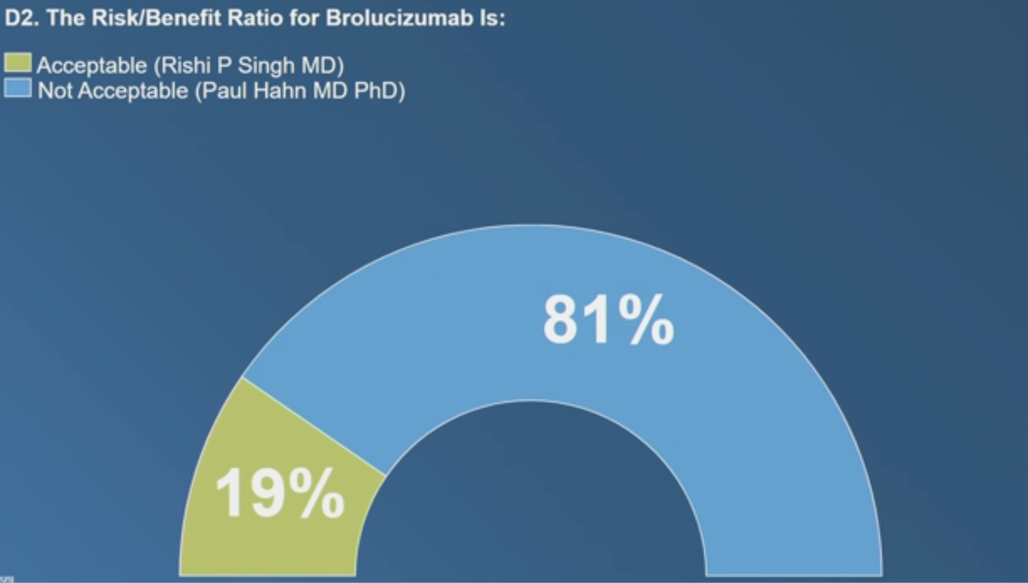 Dr. Paul Hahn, MD, PhD from NJRetina responded by pointing out that HAWK and HARRIER demonstrated the non-inferiority of change in visual acuity as the primary outcome but that superiority in drying the macula was a secondary outcome. Dr. Hahn continued to underscore the high incidence of occlusive retinal vasculitis with brolicizumab at 1:200 with 1:5 risk of subsequent devastating vision loss over 6 lines. He stated that while Novartis was quick to commission a safety committee and identify this problem, no new relevant information has come out in 2021 that would help mitigate the risk benefit profile of using brolicizumab. He acknowledged the possibility of benefits for those using a high frequency of alternative anti-VEGF agents, but stated that with pipeline therapies offering improved efficacy, longer duration and consistent safety, the risks for giving brolicizumab continue to outweigh the benefits. In closing, he cited the 2021 ASRS PAT survey in which two thirds of retina specialists stated that they would not offer brolicizumab.