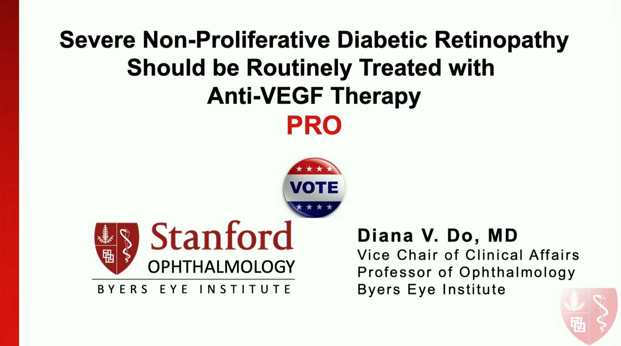 Dr. Diana V. Do, MD from Byers Eye Institute, Stanford University School of Medicine argued for use of regular anti-VEGF therapy for severe NPDR. Dr. Do began by describing the similarity between diabetic retinopathy and coronary artery and coronary vascular disease – all chronic conditions that, Dr. Do contends, require physicians to be proactive rather than reactive. Dr. Do stated that observing severe NPDR leads to 50% of these eyes to progress to PDR within 1 year (Bakri et al. 2019). RIDE, RISE and PANORAMA all demonstrate that anti-VEGF therapies reverse retinopathy, and that these effects could be achieved with q16 week dosing. The number needed to treat to prevent vision threatening complications in PANORAMA was 3 patients. Lastly, there was a statistically significant benefit with treatment as compared to observation when we look at the area under the curve in the PANORAMA study as well. Dr. Do ended by recommending we be proactive and offer this treatment to our patients before we watch them worsen.