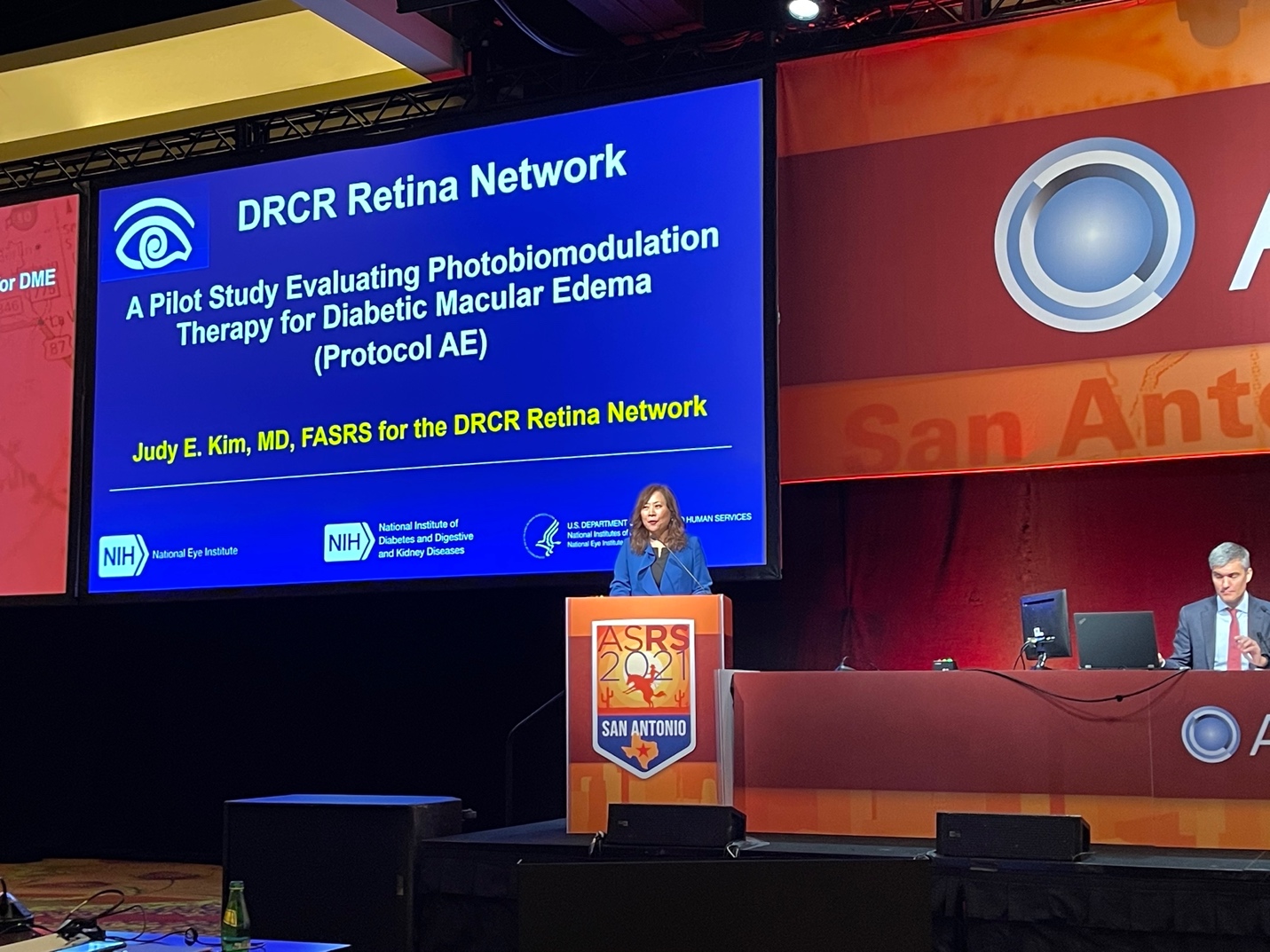 Dr. Judy Kim presented for the first time, the DRCR network’s Protocol AE, examining the effect of photobiomodulation (PBM) for DME in eyes with good visual acuity. Dr. Kim reported that this protocol had a record rate for enrollment with 100% completion rate.