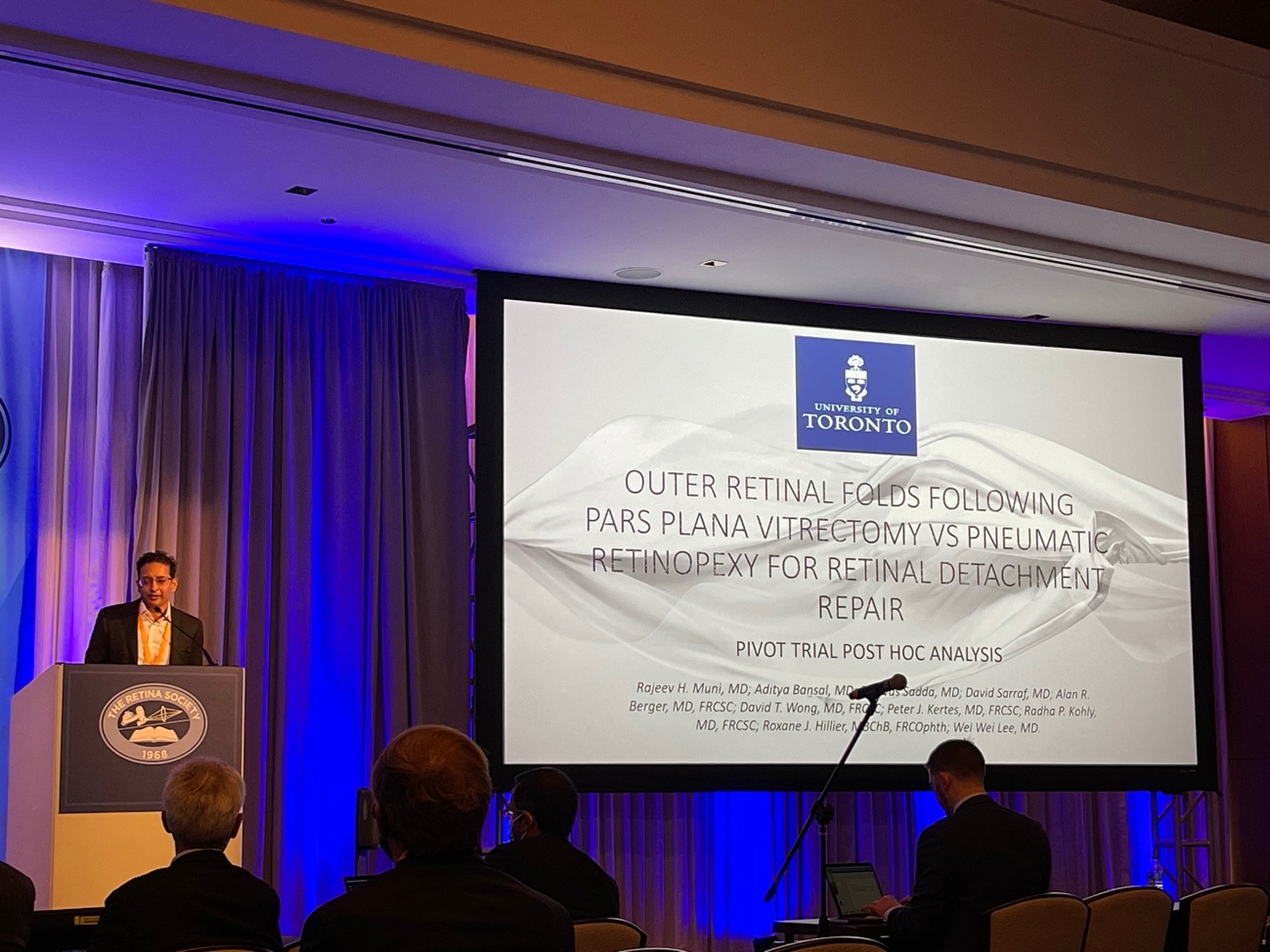 The session started off with Dr. Rajeev Muni from the University of Toronto who presented a post-hoc analysis from the PIVOT trial, focusing on the incidence and impact of outer retinal folds on visual outcomes after pneumatic retinopexy versus pars plana vitrectomy for macula-off RRDs. He found that the incidence of outer retinal folds was more common in the PPV group (34%) than pneumatic group (14%) (p=0.03). Although outer retinal folds spontaneously disappeared, outer retinal folds present at 1 months were significantly associated with worse visual acuity at 1 year. Dr. Muni concluded that not only is the retinal reattachment important but also “quality of the reattachment” is important as well.