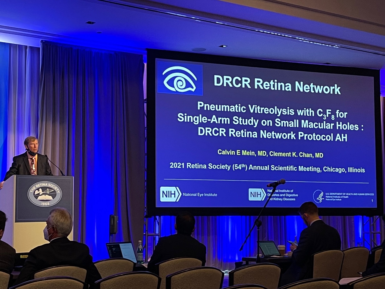 Dr. Calvin Mein from Retina Consultants of Texas then presented data from the DRCR Retina Network Protocol AH, a single-arm study on pneumatic vitreolysis using C3F8 gas for small macular holes (≤250 µm at the minimum diameter). He found that only 10 of 35 eyes (29%) achieved macular hole closure without rescue vitrectomy at 8 weeks. The mean visual change from baseline at 8 weeks was -1.5 letters.