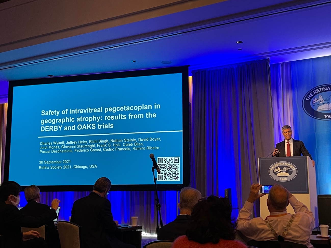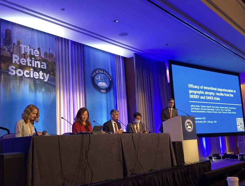 Dr. Charles Wykoff from Retina Consultants of Texas presented the safety results of the Phase 3 DERBY and OAKS trial. Overall, pegcetacoplan administered monthly and every other month was well tolerated. The rate of intraocular inflammation was 2.1% (9/419 eyes) in the monthly arm, and 1.0% (4/420 eyes) in the every other month arm (OAKS and DERBY combined). The majority of cases were mild and most patients resumed intravitreal pegcetacoplan administration. Infectious endophthalmitis occurred in 0.2% (1/419 eyes) in the monthly arm, and 0.5% (2/420 eyes) in the every other month arm, which was in line with previous prospective pivotal trials of intravitreal therapeutics. New-onset exudative AMD was developed in 6.0%, 4.1%, and 2.4% of patients in the monthly, every other month, and sham groups. Those patients continued treatment with pegcetacoplan and received anti-VEGF treatment. Based on the presentations, pegcetacoplan certainly has the potential to become the first treatment option in eyes with GA. We all look forward to seeing 24 months results in the near future.