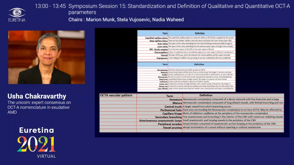 In this session, Dr. Usha Chakravarthy, professor of ophthalmology and vision sciences at the Queen’s University of Belfast, discussed the recent findings from the Unified Expert Commentary on OCTA in Neovascular AMD (UNICORN) project. The rationale for the UNICORN group was the inconsistency in definitions and descriptive nomenclature of optical coherence tomography angiography (OCTA) technology in neovascular AMD (nAMD). As a result, disparities exist in delineating tissue boundaries, contradictory findings, and a wide variety in the estimates of diagnostic accuracy using OCTA for nAMD.