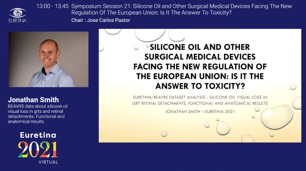 The topic of this session was an analysis of the EURETINA/BEAVRS retinal detachment dataset for silicone oil-related visual loss in patients with giant retinal tear (GRT). Silicone oil tamponade is widely used in the treatment of GRT-related detachment, however the effect of tamponade choice on visual outcome has not been evaluated.