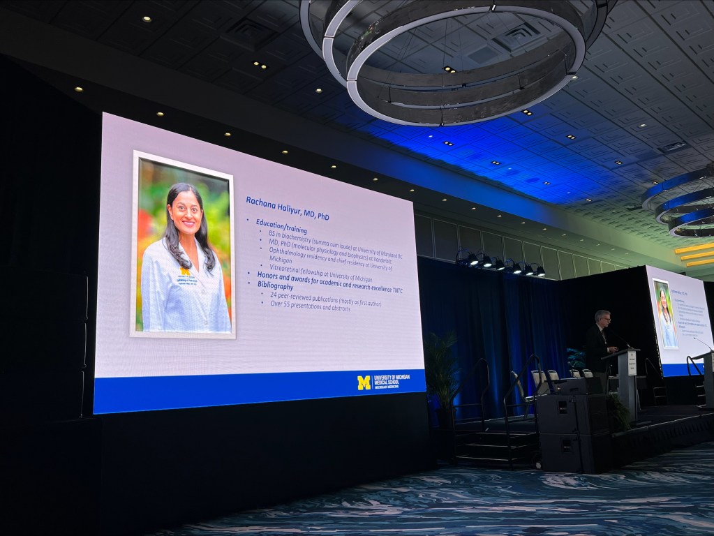 Rachana Haliyur, MD, PhD, a first year vitreoretinal fellow at the University of Michigan Kellogg Eye Center, was awarded the prestigious Evangelos S. Gragoudas Award at the 2025 Macula Society Meeting in Charlotte Harbor, FL, where she presented her work titled “Liquid biopsy for proliferative diabetic retinopathy: human vitreous single-cell transcriptomics reveals inflammatory T cell signature”.
