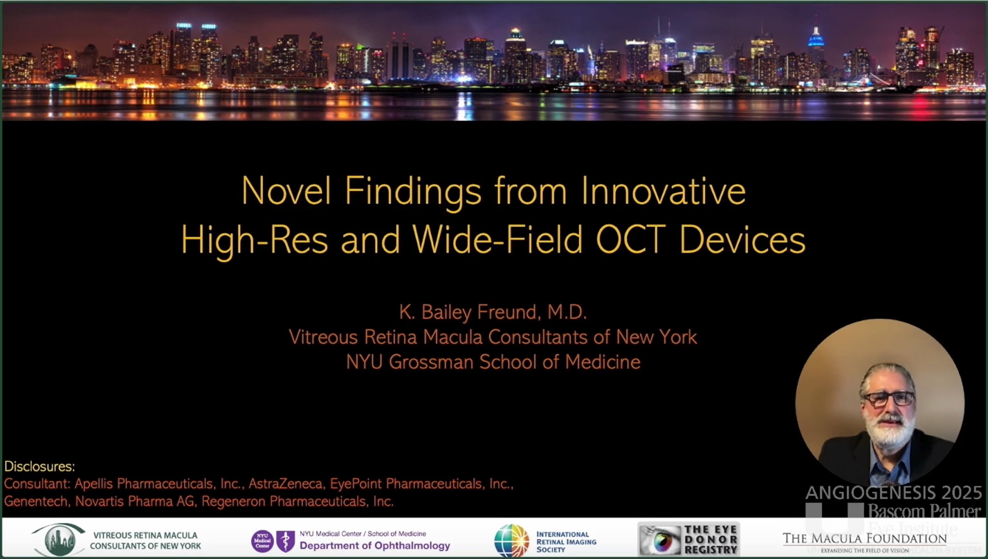 Dr. K. Bailey Freund presented a talk on “Novel Findings from Innovative High-Res and Wide-Field OCT Devices”. The background for this talk demonstrated correlation of in-vivo OCT findings in Age Related Macular Degeneration (AMD) with post-mortem histology to validate current imaging technology and showed longitudinal single patient imaging findings as AMD evolves over time. It was noted that retromode near-infrared (NIR) imaging may currently be the most sensitive technique for fully detecting the extent of sub-RPE deposits. The current most widely accepted understanding for the development of large soft drusen, is that small drusen will eventually grow over time, change composition, and merge with neighboring drusen to form the late-stage phenotype seen in AMD. Dr. Freund however, proposed an alternative mechanism for the development of large soft drusen. Considering that, other than AMD, pachy-choroid disease is one of the few pathologies that frequently manifests pigmented epithelial detachments, these patients may hold clues to the pathogenesis of RPE/Bruch’s membrane interface pathology. Dr. Freund speculates that in eyes with AMD, basilar laminar depositions and small drusen can eventually merge, and along with the RPE, separate from the inner collagenous layer of Bruch’s membrane as a continuous thickened layer. This may then allow for an accumulation of lipoprotein rich lipid pools in the sub-RPE space, resembling the clinical finding of soft drusen. This mechanism may be shared with patients who present with typical pachy-choroid disease findings on OCT as well. Dr. Freund showed multiple longitudinal and cross-sectional cases that lend credibility to this potential pathogenesis in vivo with high-resolution OCT. Careful scrutiny of in vivo clinical imaging, particularly over extended follow-up intervals and using more refined retinal techniques may inform efforts to fill gaps in knowledge of the understanding of AMD progression.