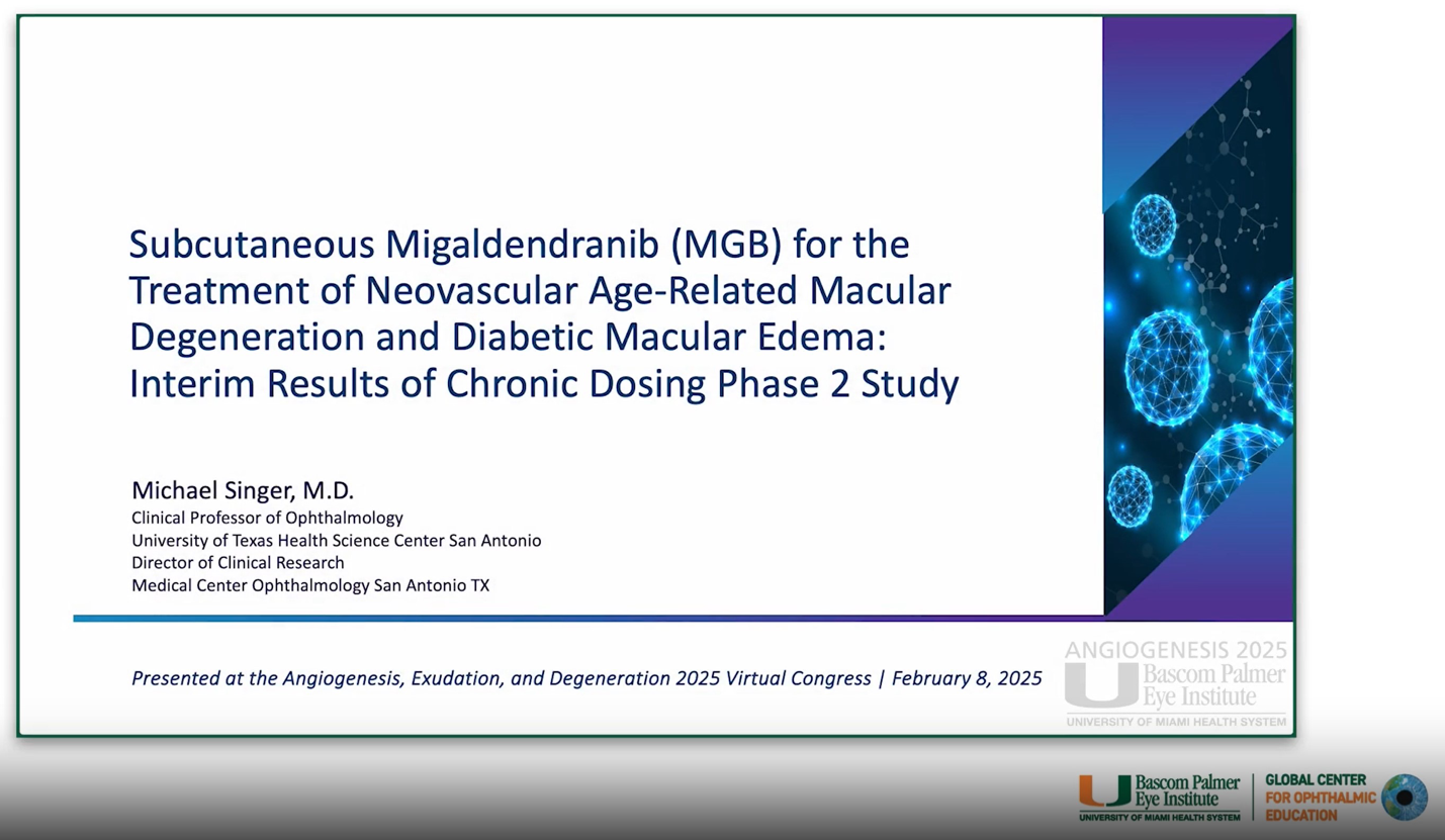 Dr. Michael Singer presented a discussion on “Subcutaneous Migaldendranib (MGB) for the Treatment of Neovascular Age-Related Macular Degeneration and Diabetic Macular Edema: 9 Month Results of Chronic Dose Phase 2 Study”. Subcutaneous (subQ) migaldrendrinib is a novel, first-in-class drug in clinical development for the potential at-home treatment of wet AMD and DME. This drug, MBG, is a VEGF receptor tyrosine kinase inhibitor covalently linked to a hydroxyl dendrimer (nanomedicine), that targets inflammation without systemic side effects. This medication is ideal for chronic bilateral disease as it has the potential to treat both eyes with a single subQ administration. Its subQ administration also provides an excellent ocular safety profile. Its lack of systemic side effects is secondary to its specificity and rapid clearance. It binds to and is uptaken by RPE cells, macrophages, and microglia in choroidal neovascular lesions, and is retained by these cells for 30 days despite being renally cleared in 2 days. This study involved 27 patients (16 wet AMD/11 DME) and evaluated the safety and tolerability of subQ MGB as its primary measures. Patients included in the study had to have been treated with intravitreal injections for at least twelve weeks, demonstrated a reduction in fluid and then re-accumulated this fluid after cessation of treatment before enrollment in the study. Ultimately, the phase 2 chronic dose clinical study interim results (at 24 weeks) demonstrated that this treatment was safe and well tolerated. The most common side effect was local injection site reactions, which were typically transient and mild. There were no treatment-related systemic serious adverse events. There was a greater than 69% reduction in the need for supplemental anti-VEGF IVT in wet AMD and DME subjects. The study also demonstrated maintenance of Mean Central Subfield Thickness (CST) and Best Corrected Visual Acuity (BCVA) in wet AMD subjects, as well as maintenance of CST with modest increases in BCVA in DME subjects. Finally, there was a similar efficacy manifested in the “fellow eyes” to those being monitored in the study. Full end-study results will be presented at an upcoming conference.