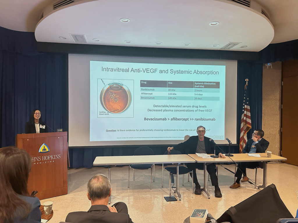 Dr. Cindy Cai provided insight on the use of big data in retina research, particularly research related to social determinants of health. She discussed the benefits and limitations of distributed data networks like the Observational Health Data Sciences and Informatics (OHDSI) community for sharing and analyzing outcomes data internationally. She presented the results of two interesting recent studies: 1) there was no increased risk of ranibizumab compared to other anti-VEGF agents with respect to risk for kidney failure, and 2) higher scores on a social determinants of health variable, reflecting factors like insurance status and food security, were associated with lower utilization of eye care.