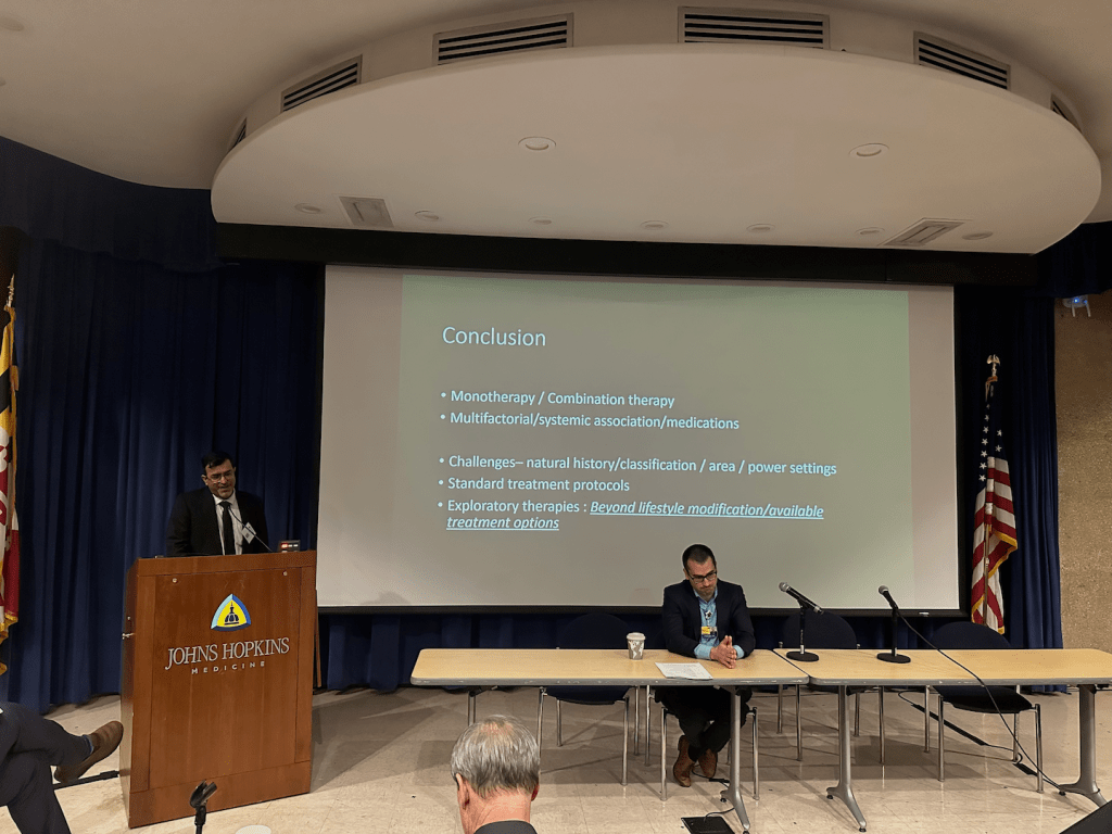 Dr. Jay Chhablani spoke on challenges in classifying and treating central serous chorioretinopathy (CSCR). He presented his group’s recent studies showing very poor inter-rater agreement on the severity of CSCR and proposing an alternative classification model based on multimodal imaging. He critiqued wide variability among past RCTs in the definitions of acute and chronic disease as well as the use of BCVA as an outcome. He highlighted highly varied recently published options including faricimab, topical fluorometholone, brachytherapy, and even medical marijuana. He concluded by sharing plans for an upcoming natural history study in CSCR through the DCRC network. The audience shared skepticism about the efficacy of marijuana in this setting.