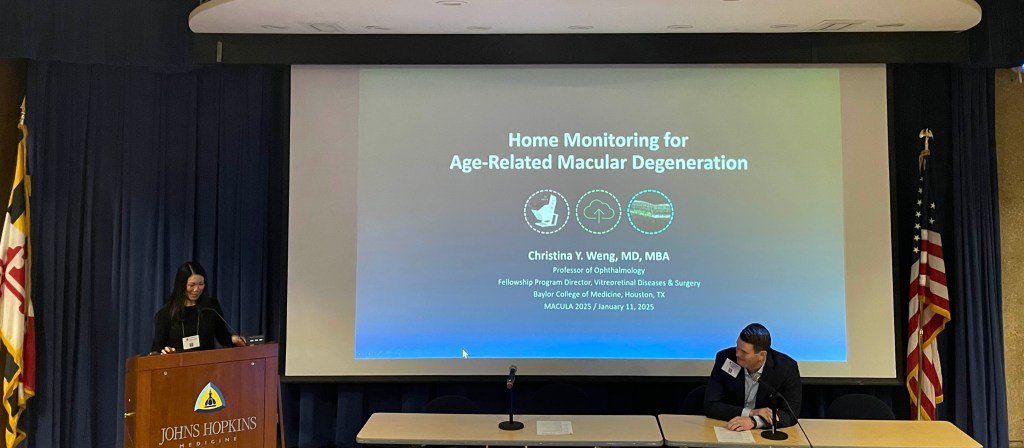 Dr. Christina Weng of Baylor University opened with her talk, entitled “Home Monitoring for Age-related Macular Degeneration.” She introduced the FDA-approved home OCT as a means to optimize the way we manage AMD. As patients acquire daily OCT scans, the total volume for each day is mapped to fluid volume trajectory. Dr. Weng presented a newly-diagnosed wet AMD patient who received a single anti-VEGF injection and then was able to immediately extend to 12 weeks before fluid recurred, an interval that typically takes 44 weeks or longer to reach. The DRCR Retina Network Protocol AO is conducting a multi-center randomized clinical trial of 600 treatment-naive eyes with wet AMD from 80 sites. The patients will be randomized 1:1 into either a treat and extend or home OCT-guided treatment arm, and all eyes will receive faricimab. She hopes recruitment will be completed near the end of 2025.