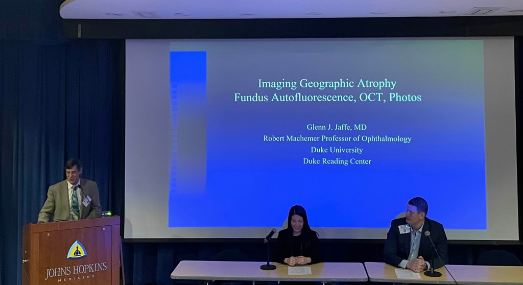Dr. Glenn Jaffe of Duke University presented on “Imaging Geographic Atrophy: Autofluorescence, OCT, Photos.” He opened by discussing his research comparing single drusen size on color fundus photography and spectral-domain OCT, noting that it was easier to diagnose drusen on OCT and identify non-drusen pathological features. The talk shifted to discuss geographic atrophy, which is imaged in a variety of different methods: color fundus photography, FA, FAF, NIR, OCT, and emerging AI approaches. For the clinic and clinical trials, his approach begins with en face imaging to obtain a global impression of the atrophy. He suggests using a B-scan to confirm the images depict geographic atrophy using consensus on atrophy meeting group (CAM) criteria: loss of outer retina, loss of RPE at least 250 microns, and loss of choroidal hypertransmission at least 250 microns. Area of GA can be measured on FAF and NIR, and OCT can assist in defining the boundaries. To conclude, he presented AI as a means to improve accuracy in the future, and he described high performance of some recent algorithms, but Dr. Jaffe suggests that additional validation is needed.