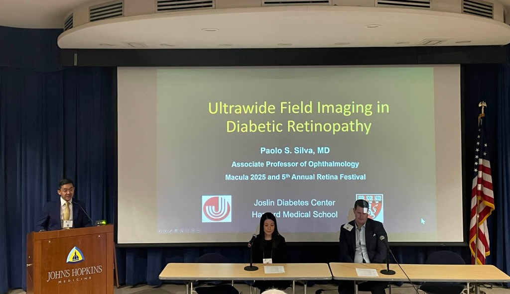 Dr. Paolo Silva of Joslin Diabetes Center discussed “Ultrawide Field Imaging in Diabetic Retinopathy.” Dr. Silva began his talk by stating that current diabetes and eye treatments combined with telemedicine may reduce the incidence of diabetes-related blindness by as much as 95%. However, ungradable image rates can adversely impact telemedicine programs. The transition to UWFI combats this, as the ungradable image rate is reduced from 10% to 3% per patient while speeding up image evaluation and acquisition time. He then described DRCR Protocol AA, a prospective, observational longitudinal study which evaluated whether the detection of predominantly peripheral lesions (PPL) improves the ability to predict rates of retinopathy worsening over time beyond the risk associated with baseline ETDRS DRSS level. Eyes with FA-PPL had a 1.7-fold greater risk of disease worsening over 4 years and were consistent within DR severity subgroups. His research has shown that worse DRSS severity and the presence of PPL are strongly associated with increased nonperfusion. DR lesions identified in UWF-color or UWF-FA images, regardless of lesion location, carry a similar risk of disease worsening. His work suggests that identification of lesions throughout the entire retina is critically important to accurately stratify the risk for progression over time. He concluded that UWF-color and UWF-FA images may provide additional prognostic value in determining the risk of DRSS worsening, and that accurate classification of overall disease severity and progression can be improved by accounting for lesions predominantly outside the ETDRS fields.