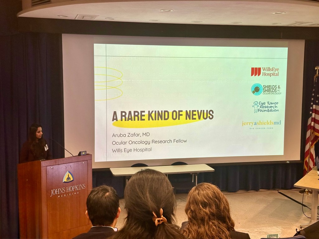 The session concluded with Dr. Aruba Zafar, an ocular oncology fellow from Wills Eye Hospital, presenting a case of phakomatosis pigmentovascularis. The patient exhibited bilateral nevus flammeus, diffuse scleral and iris melanocytosis, and choroidal hyperpigmentation. Genetic testing revealed a GNA11 mutation. Dr. Zafar emphasized the importance of a multidisciplinary approach, as these patients are at risk for glaucoma, choroidal hemangioma, and CNS lesions.