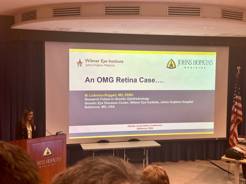 Next, Dr. M. Ludovica Ruggeri from Wilmer Eye Institute presented a case of a woman in her 30s with a past ocular history of bilateral optic atrophy who presented for evaluation of decreased visual acuity in both eyes since childhood. She was noted to have a family history of progressive vision loss in multiple family members. OCT demonstrated a “fuzzy” disruption of the EZ line in both eyes. While microperimetry was unremarkable, full-field ERG revealed moderate generalized cone dysfunction. Dr. Ruggeri emphasized the importance of utilizing a multifocal ERG in this case which revealed foveal suppression, in both eyes. The patient subsequently underwent genetic testing and was diagnosed with RP1L1 related occult macular dystrophy.