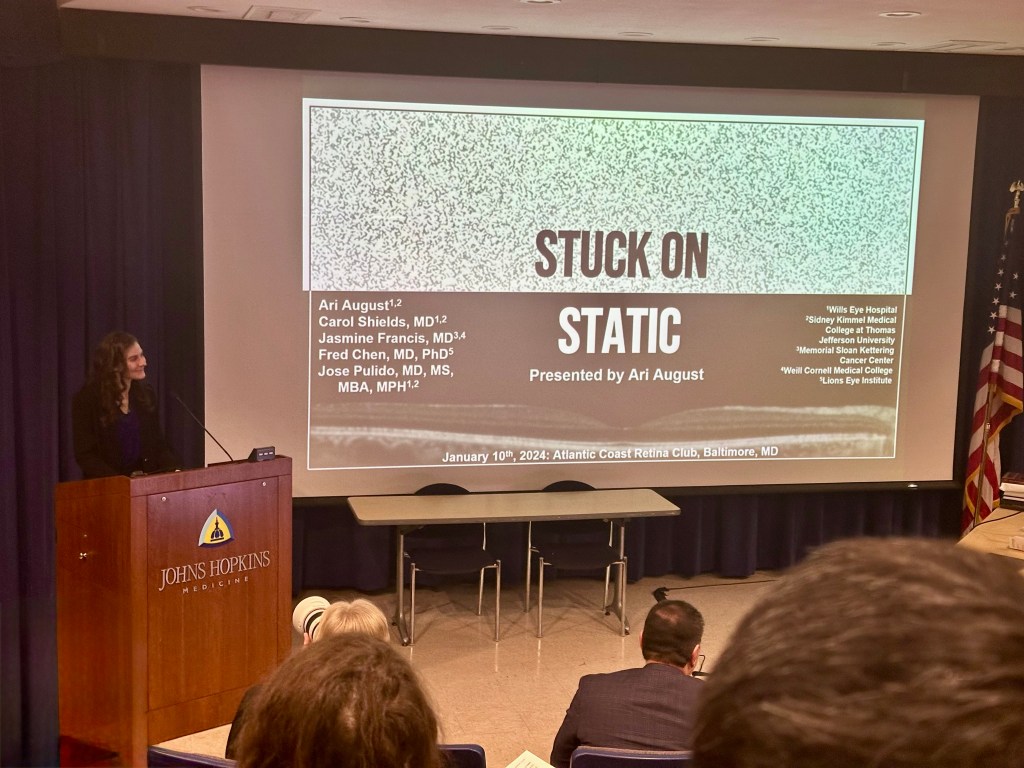Ari August, one of the award winners, presented a case of man who had presented for an annual eye examination. OCT retina of the right eye showed subtle loss of inner retinal laminations, pinpoint hyper-reflective foci at the fovea and irregular reflectivity of the IS/OS junction. Similar findings were noted in the left eye OCT. Fundus autofluorescence showed stippled hyper and hypofluorescence. The patient was also noted to have dermatologic findings and upon further history, also reported pulmonary and renal issues. The patient was diagnosed with the rare condition of Birt-Hogg-Dube syndrome.