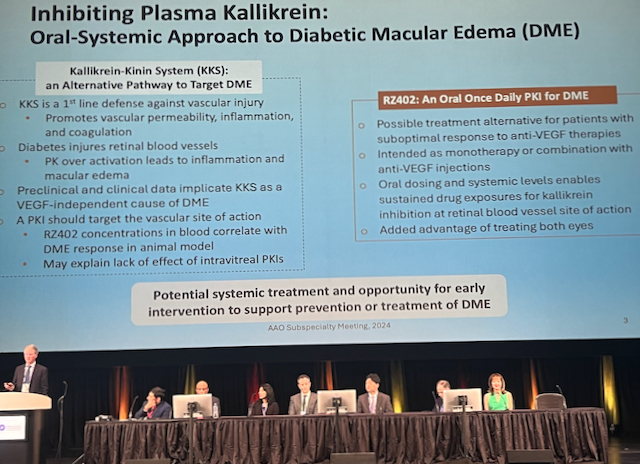 Drs Joel Pearlman and Alex Melamud presented on novel systemic therapies for retinal diseases, with Dr. Pearlman showing the effect of the kallikrein inhibitor RZ402-201 on DME, and Dr. Melamud the effect of gildeuretinol on geographic atrophy.