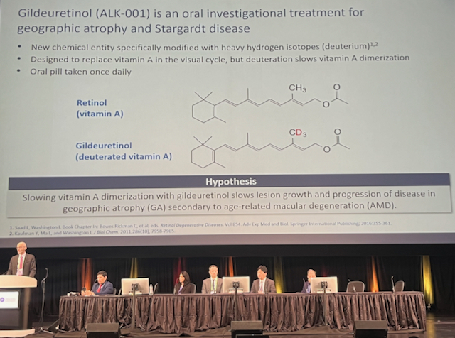 Dr. Melamud and collaborators presented the effect of gildeuretinol, vitamin A which is modified with heavy hydrogen, on GA in dry AMD and Stargardt’s disease. These two diseases are driven by the accumulation of lipofuscin, a metabolic waste product of the visual cycle produced following the dimerization of vitamin A. Because gildeuretinol slows vitamin A dimerization, Dr. Melamud tested whether it could slow the progression of geographic atrophy. 135 patients with GA were given daily oral gildeuretinol, while 63 were given a placebo drug. The rate of adverse events and withdrawal from study was comparable between placebo and study groups. No intraocular inflammation, vasculitis, or signs of hypervitaminosis or hypovitaminosis A were attributed to the drug. The investigators planned to perform sensitivity analysis after 6 months of drug administration, given the amount of time estimated to replace systemic vitamin A stores in patients. Analysis of GA area and low-luminance visual acuity between patients on gildeuretinol and placebo showed significantly decreased GA lesion growth rate and preserved vision at 24 months. Gildeuretinol is the first oral drug to show functional benefit in geographic atrophy.