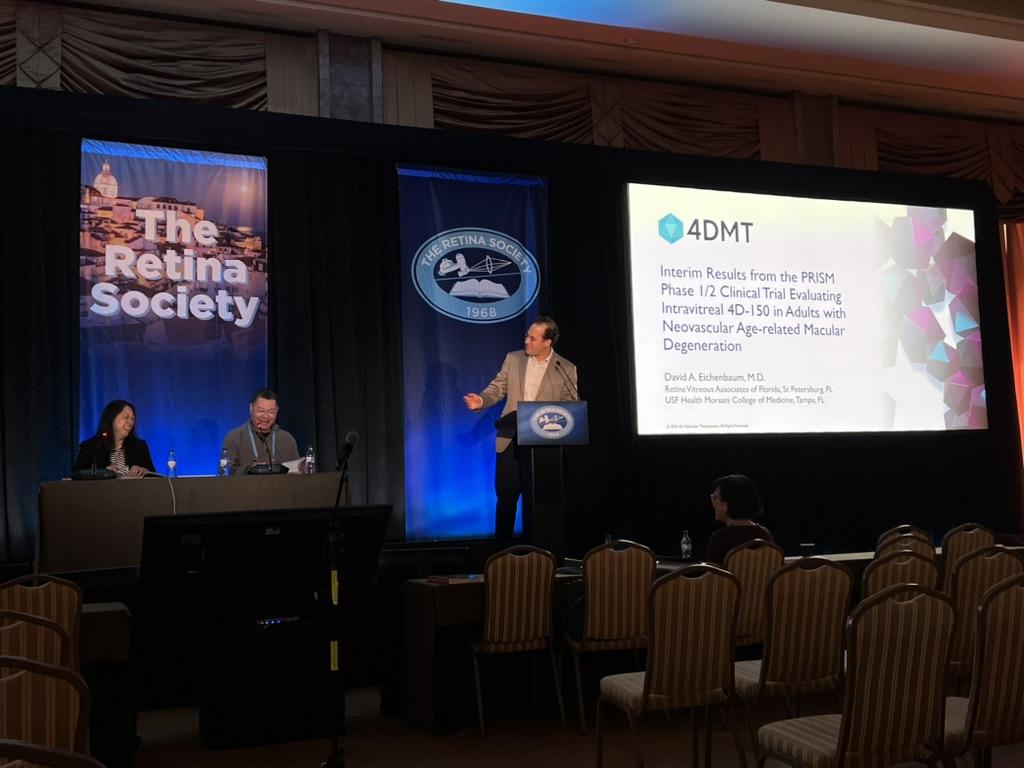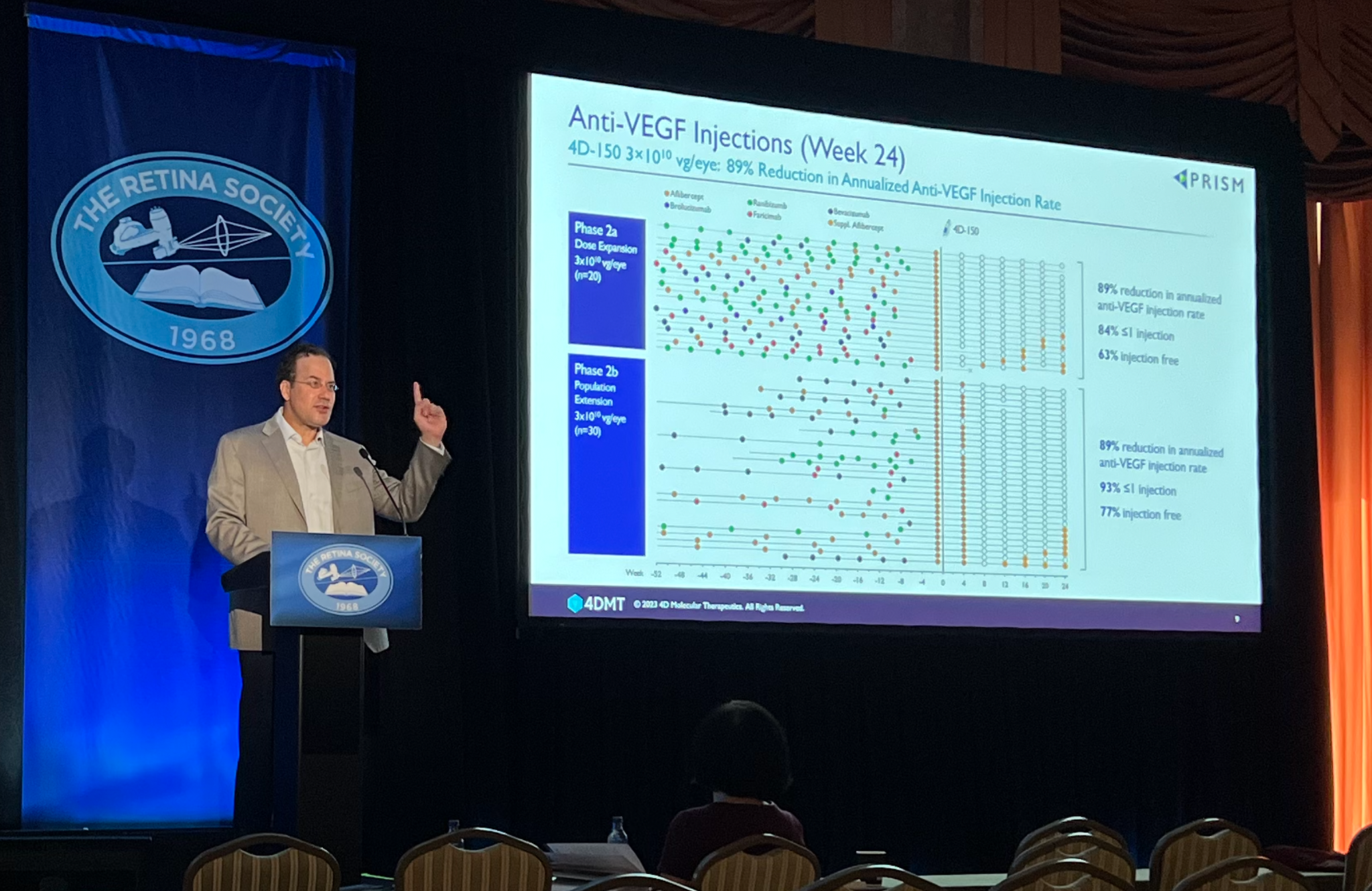 Dr. David Eichenbaum presented the second late breaking abstract, “Interim Results from the PRISM Phase 1/2 Clinical Trial Evaluating Intravitreal 4D-150 in Adults With Neovascular Age-Related Macular Degeneration.” This Phase 1/2 clinical study evaluated AAV intravitreal gene therapy for neovascular AMD developed by the pharmaceutical company 4DMT, from which Dr. Eichenbaum receives research grant support.
