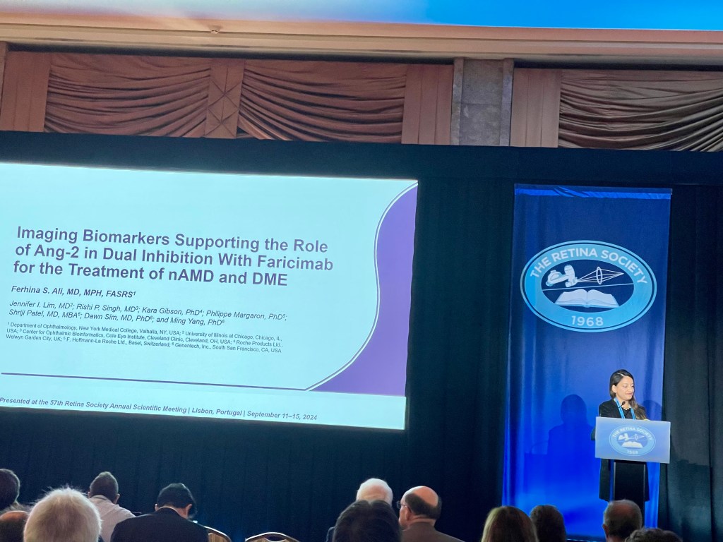 Dr. Ferhina Ali discussed “Imaging Biomarkers Supporting the Role of Ang-2 in Dual Inhibition With Faricimab for the Treatment of nAMD and DME.” Here, Dr. Ali and colleagues evaluated faricimab, a dual Ang-2/VEGF-A inhibitor, against aflibercept in patients with neovascular age-related macular degeneration (nAMD) and diabetic macular edema (DME). Imaging biomarkers from the TENAYA, LUCERNE, YOSEMITE, and RHINE trials were assessed. Results demonstrated faricimab’s superior reductions in central subfield thickness (CST) and fluid resolution compared to aflibercept, noting that pigment epithelial detachments (PED) were also reduced in size with faricimab. Dr. Philip Ferrone echoed these findings and discussed a post-hoc analyses of TENAYA and LUCERNE exploring the effect of faricimab compared to aflibercept on eyes with large serous PEDs in neovascular AMD. Faricimab-treated patients had a faster reduction in PED thickness compared to aflibercept, with a smaller proportion of eyes exhibiting persistent serous PED by week 12 and 48.