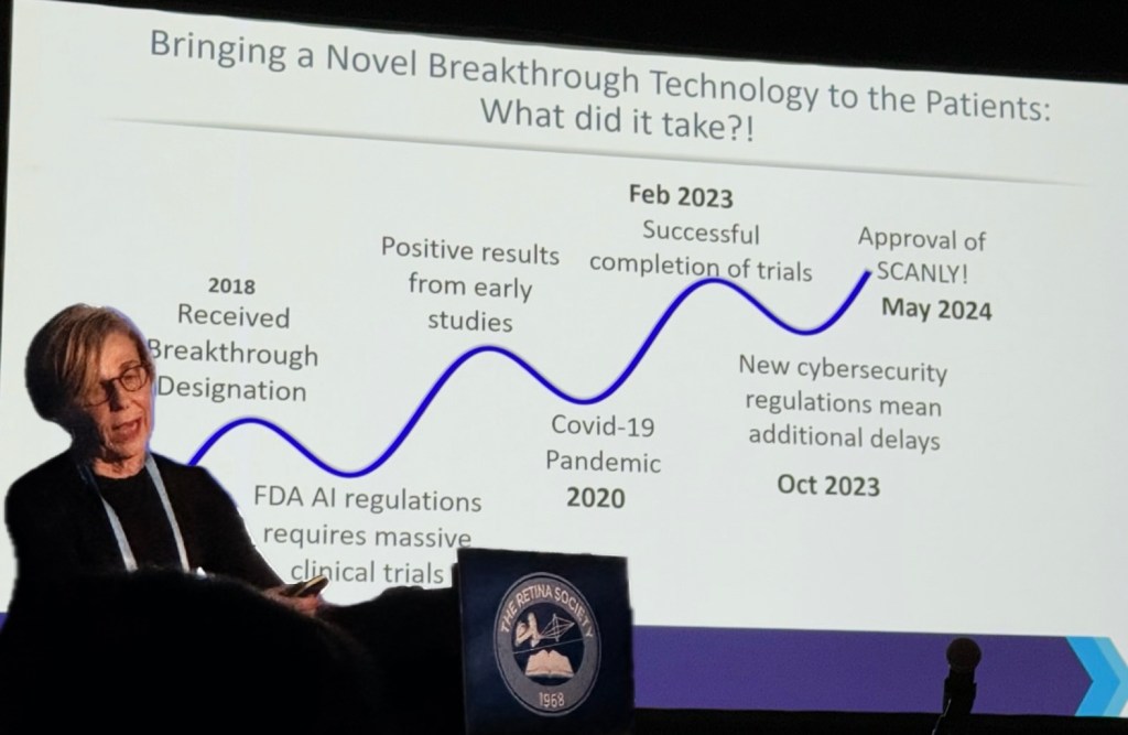 Dr. Loewenstein highlighted the ability of home OCT to quickly identify “non-responders” and reduce treatment burden in excellent responders. Home OCT often altered the decisions of retina providers in a retrospective hypothetical environment – guiding the decision to forego treatment 43% of the time and guiding the decision to treat earlier 61% of the time, compared to our standard of care with in-office OCT. She likened home OCT to similar endeavors in other fields, such as glucose monitoring or EKG monitoring with at-home medical devices. Overall, Dr. Loewenstein sees significant advantages of home OCT in all stages of nvAMD treatment – Initiation, extension, maintenance, and even cessation. As a final point, she acknowledged possible reimbursement obstacles with home OCT devices, but reminded us that innovation is advantageous for the field of retina as a whole.