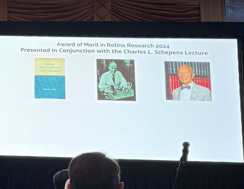 The Award of Merit in Retina Research was started in 1978 by the Retina Research Foundation to recognize an outstanding vision scientist. Each year, the awardee is invited to give the Charles L. Schepens Lecture – named after the founder of the Retina Society, a historic innovator who brought us the binocular indirect ophthalmoscope among other inventions, and often credited with establishing surgical retina as a subspecialty.