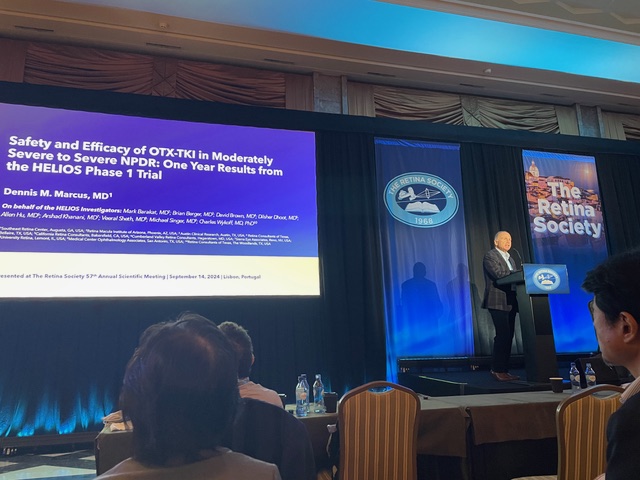 The session began with Dennis Marcus, MD who presented the safety and efficacy of the intravitreal OTX-TKI implant, one-year results from the HELIOS Phase I trial. OTX-TKI (axitinib) is a sustained-release tyrosine kinase inhibitor that enables internal blockade of multiple VEGF pathways. A multi-center, double-masked, 2:1 randomized Phase I trial was performed in patients with moderately severe to severe NPDR (DRSS levels of 47 or 53) with CI-DME (as assessed by investigator) and baseline visual acuity of approximately 20/40 or better. The data included 21 patients, who received either OTX-TKI (n=13) or sham procedure (n=8). The primary outcome was safety and tolerability, and secondary outcomes included changes in the Diabetic Retinopathy Severity Scale (DRSS), best corrected visual acuity (BCVA), central subfield thickness (CST), and rates of needing rescue therapy.